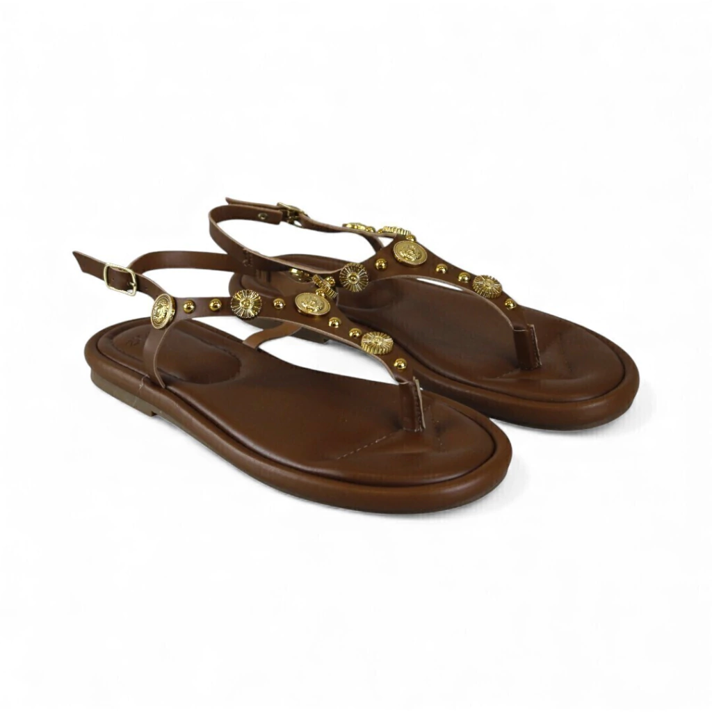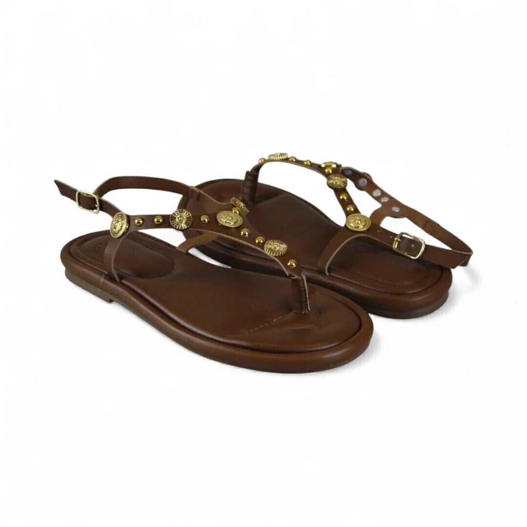 DESCRIÇÃO:Rasteira feminina marrom em estilo chinelo (tira em Y) com tira posterior ajustável por fivela dourada ao redor do calcanhar. Cabedal fino decorado com aplicações metálicas douradas (medalhões e tachas) ao longo da tira central. Palmilha acolchoada no mesmo tom marrom com costura visível, sola plana levemente elevada no calcanhar. Visual sofisticado com detalhes dourados.
