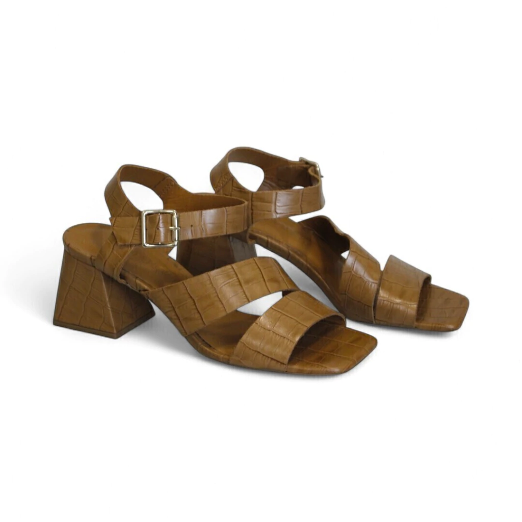 DESCRIÇÃO:sandália feminina de salto blocado, feita em material marrom em couro croco (padrão escamado). O salto é médio e largo, oferecendo estabilidade. A sandália possui três tiras frontais largas e uma tira no tornozelo com fivela metálica ajustável. A ponta é levemente quadrada, e o design geral combina estilo moderno com um toque clássico.