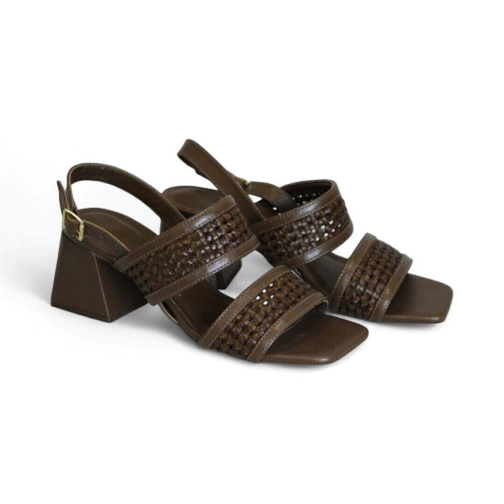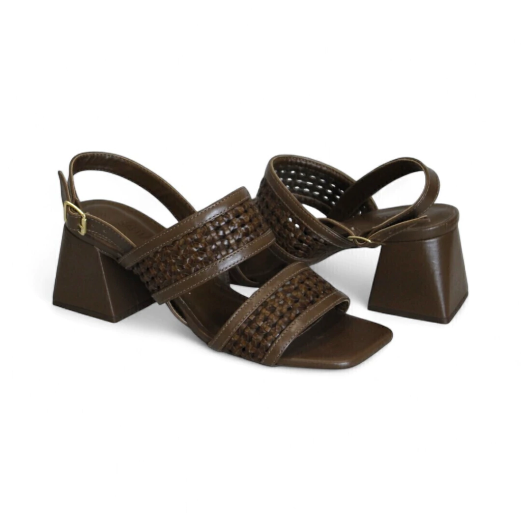 DESCRIÇÃO:Sandália feminina de salto bloco na cor marrom escuro (chocolate), com um design que combina tiras lisas e texturizadas: