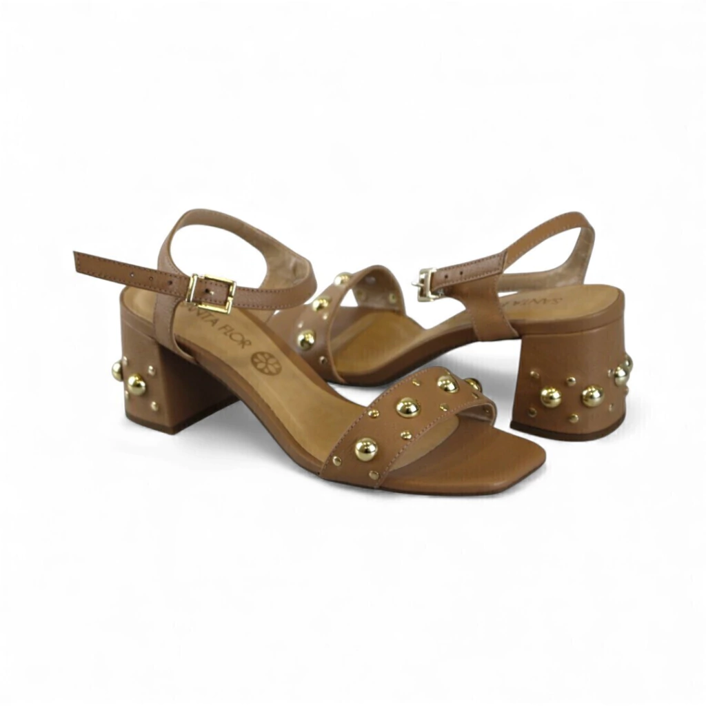 DESCRIÇÃO: Sandália feminina caramelo em material liso, bico quadrado, tira frontal larga com aplicações de tachas/esferas douradas e pequenos rebites; tira de tornozelo com fivela dourada ajustável. Salto bloco médio revestido com aplicações douradas na lateral, palmilha levemente acolchoada e solado fino escuro.