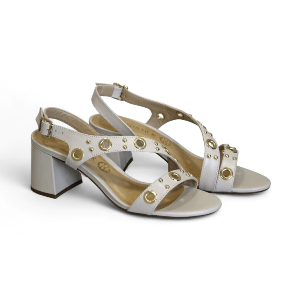 DESCRIÇÃO:Sandália feminina de salto bloco médio, na cor branco gelo, com tiras finas cruzadas adornadas por ilhoses e aplicações metálicas douradas. Possui fechamento com fivela no calcanhar e bico levemente quadrado, combinando elegância e modernidade.