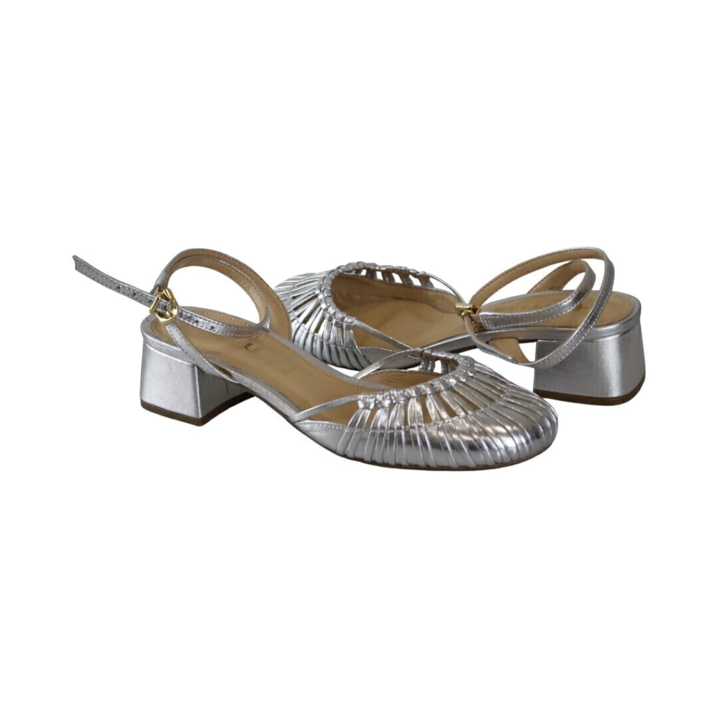 DESCRIÇÃO:Sandália feminina slingback metalizada prateada com acabamento acetinado. Cabedal frontal fechado e arredondado composto por tiras finas pregueadas/entrelaçadas, formando efeito texturizado e detalhe franzido na abertura superior. Tira de tornozelo fina com fivela dourada ajustável; contraforte aberto atrás. Salto bloco baixo, revestido na mesma cor, oferecendo estabilidade. Palmilha nude levemente acolchoada. Visual elegante e confortável, indicado para ocasiões casuais e eventos.