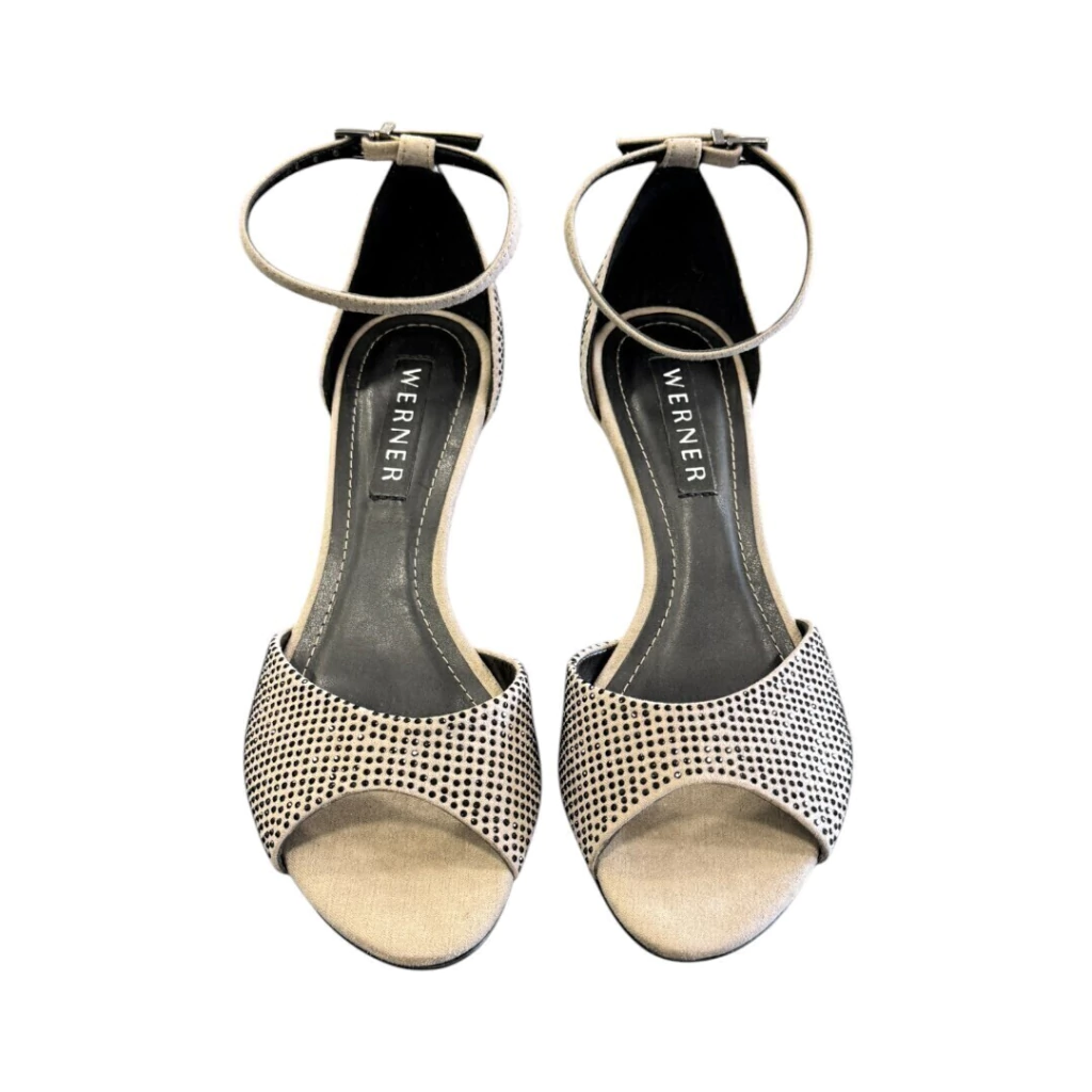 DESCRIÇÃO: A imagem apresenta um par elegante de sandálias de salto médio em tons de bege e cinza. O design combina materiais texturizados, com a parte frontal em camurça e detalhes em tecido com pequenos orifícios, proporcionando um efeito visual interessante. A sandália é aberta na frente, com um recorte que revela os dedos, e possui uma alça ajustável no tornozelo, garantindo conforto e segurança. O salto é fino e esguio, acrescentando um toque de sofisticação ao modelo. Essas sandálias são ideais para eventos formais ou ocasiões especiais, equilibrando estilo e conforto de maneira charmosa.