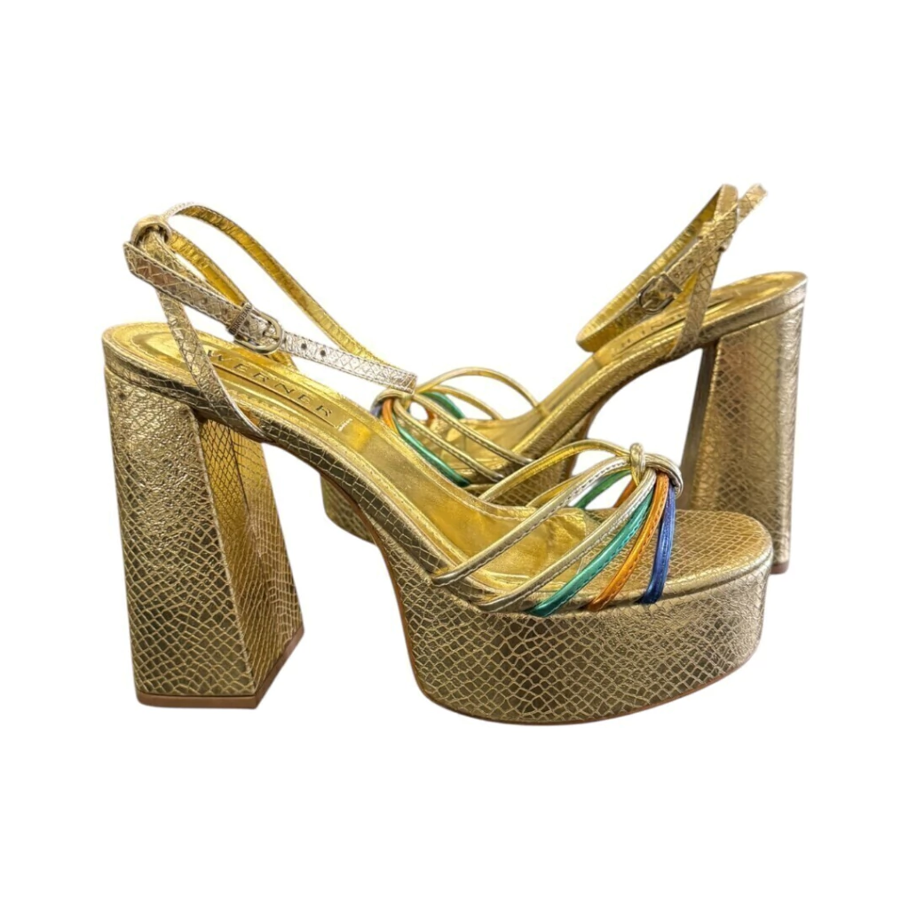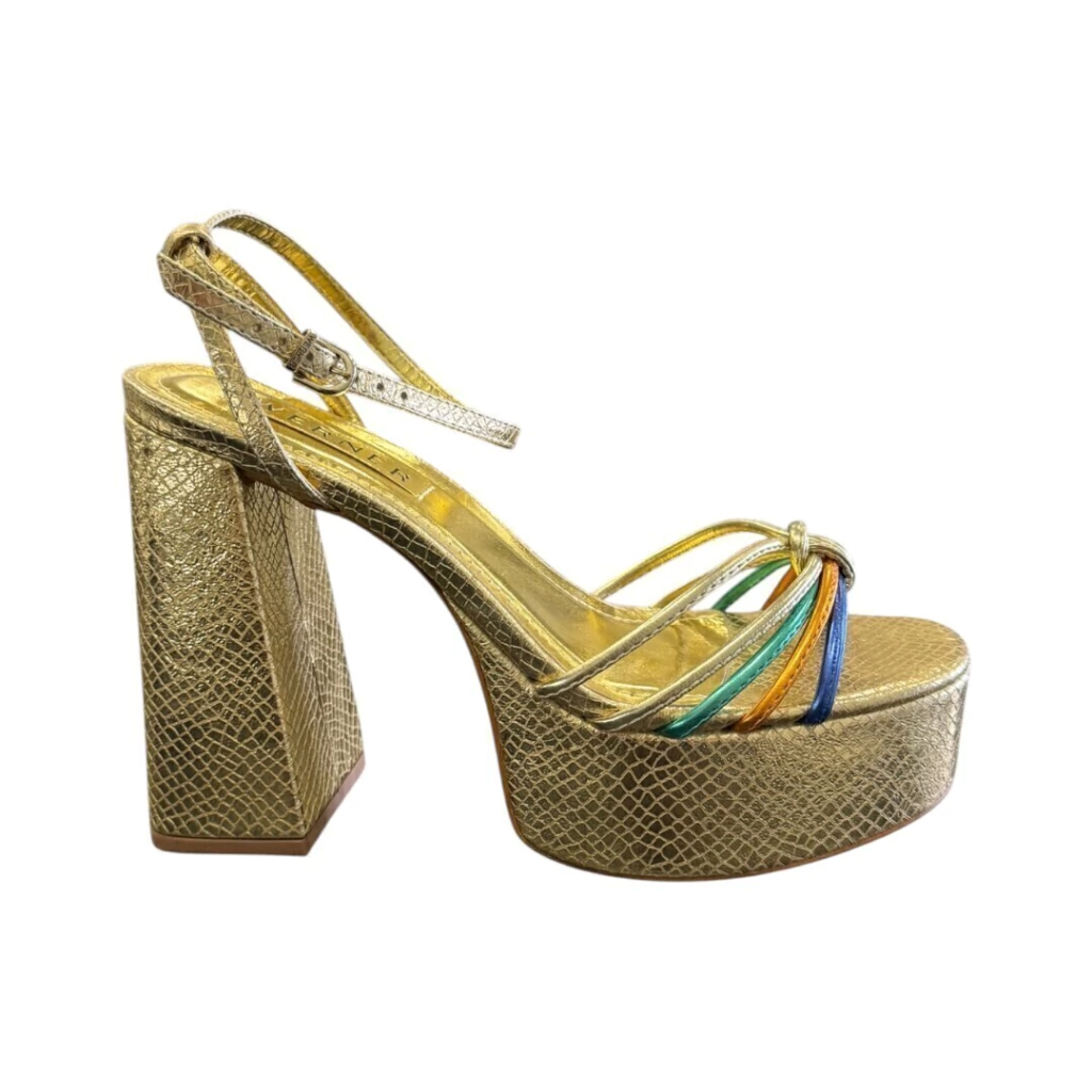 DESCRIÇÃO: A imagem apresenta um par vibrante de sandálias de salto alto, com um design deslumbrante. O acabamento é dourado e texturizado, lembrando couro. A sandália possui um salto bloco robusto, que proporciona estabilidade, e uma plataforma na parte frontal que equilibra a altura do salto. As tiras são finas e entrelaçadas, com detalhes em cores variadas, como azul, verde, laranja e amarelo, que adicionam um toque divertido e colorido ao modelo. A alça no tornozelo possui uma fivela para ajuste, garantindo conforto e segurança. Essas sandálias são perfeitas para festas e eventos, unindo glamour e estilo de maneira ousada.