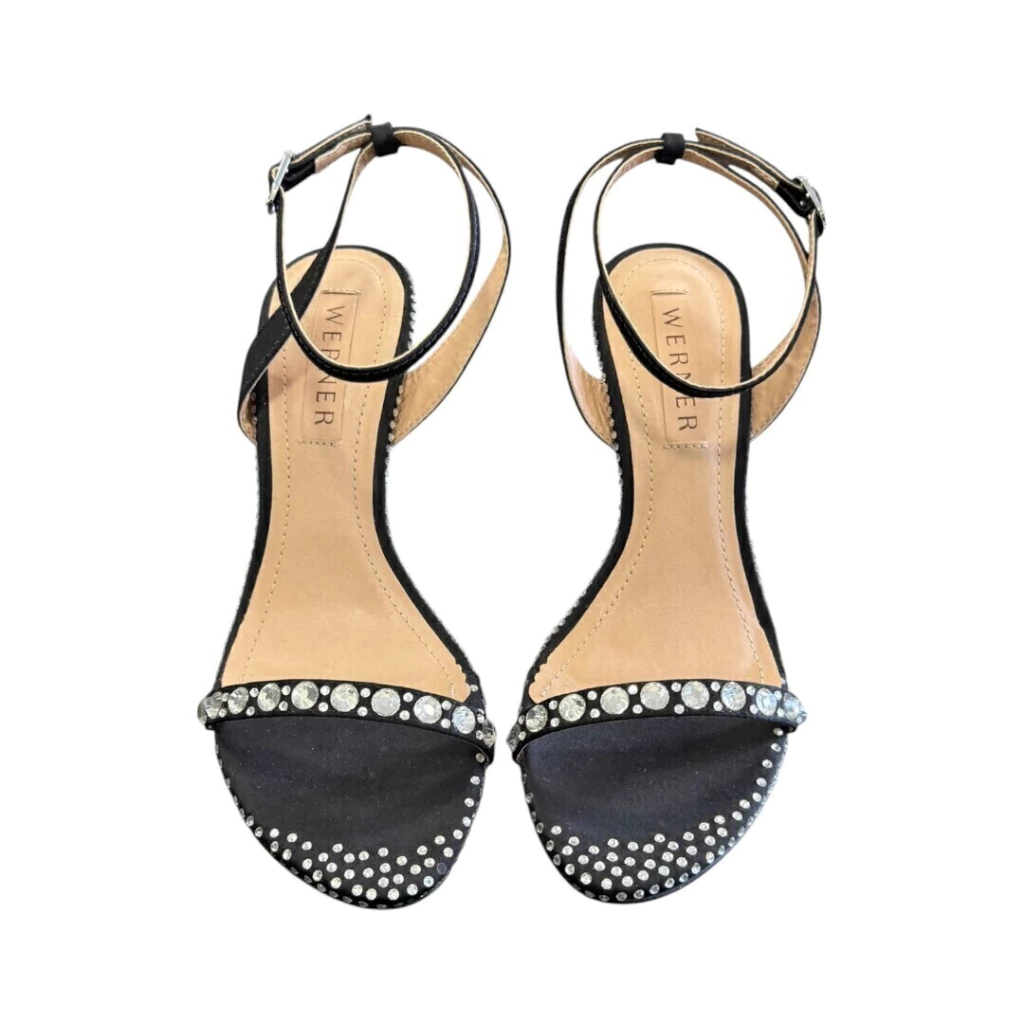 DESCRIÇÃO: A imagem apresenta um par deslumbrante de sandálias de salto alto em um tom preto sofisticado. O design é elegante, com tiras finas que destacam o pé, e um salto alto e esguio que adiciona altura e glamour. A parte frontal é adornada com strass brilhantes, criando um efeito cintilante que chama a atenção. A sandália possui uma alça no tornozelo com fivela para ajuste, proporcionando segurança e conforto. O acabamento luxuoso e os detalhes brilhantes tornam essas sandálias ideais para eventos formais, festas ou ocasiões especiais, unindo estilo e sofisticação de maneira impressionante.