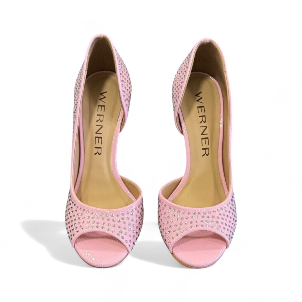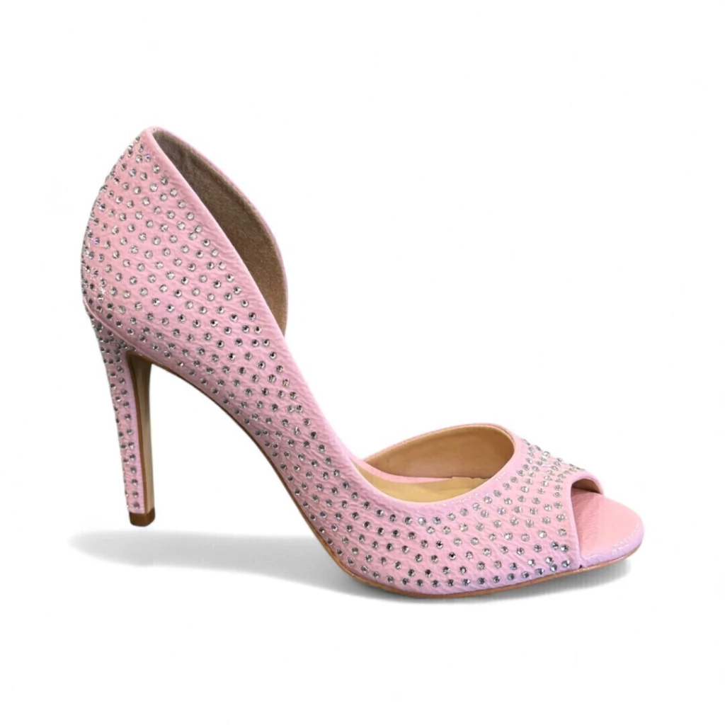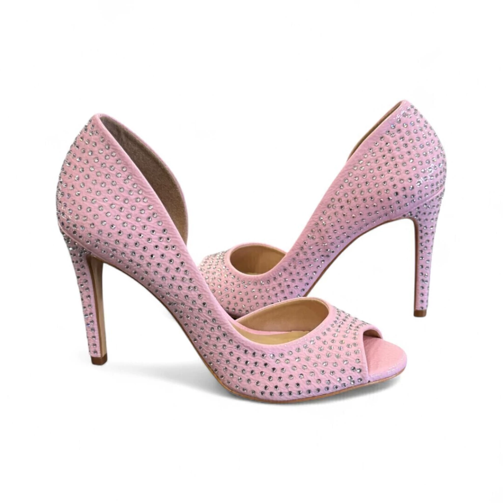DESCRIÇÃO: A imagem exibe um par deslumbrante de sapatos de salto alto em um delicado tom de rosa. O design é adornado com pequenas pedras brilhantes que cobrem a superfície, conferindo um aspecto glamouroso e sofisticado. A parte frontal é aberta, com um recorte em forma de "peep toe", que adiciona um charme extra ao modelo. O salto é alto e esguio, proporcionando uma silhueta elegante. Combinando estilo e brilho, essas sandálias são perfeitas para ocasiões especiais, como festas e eventos formais, destacando-se como uma peça statement em qualquer look.