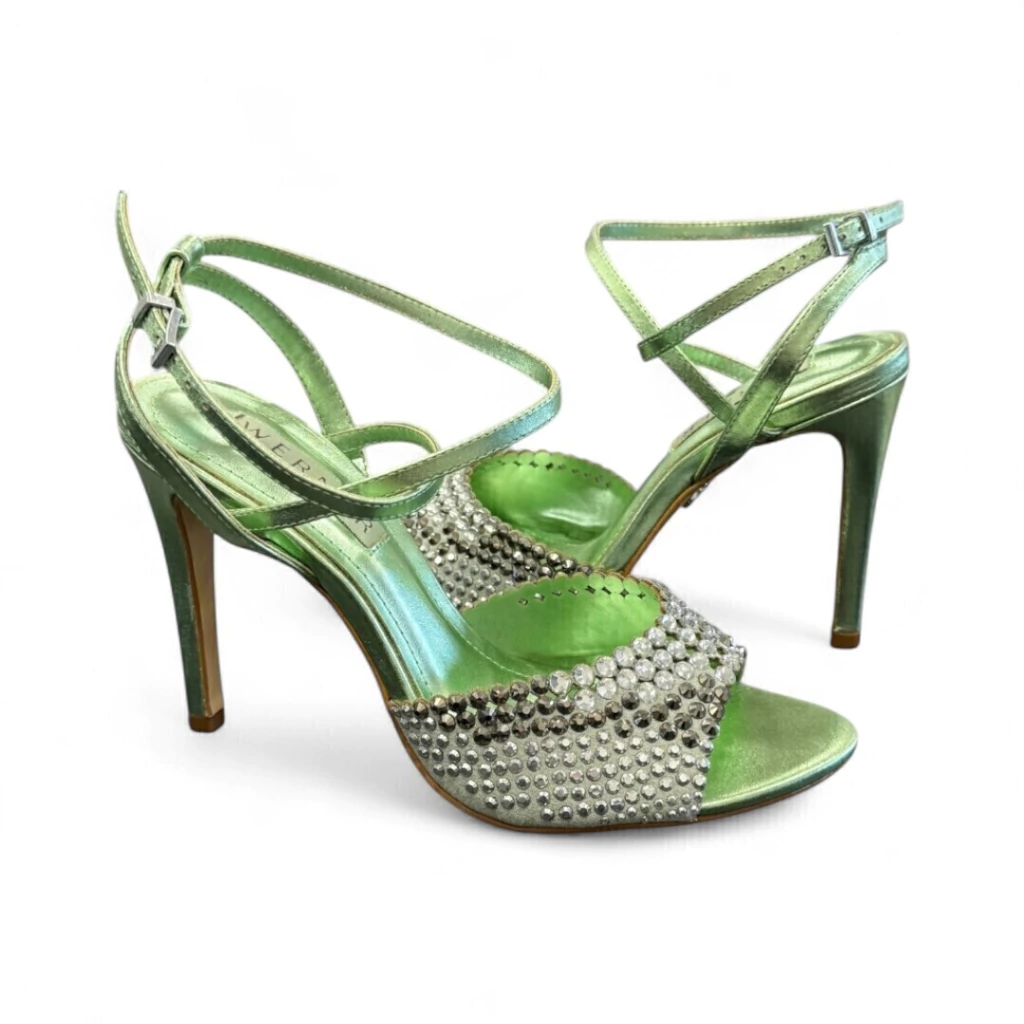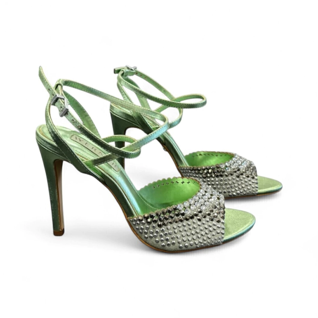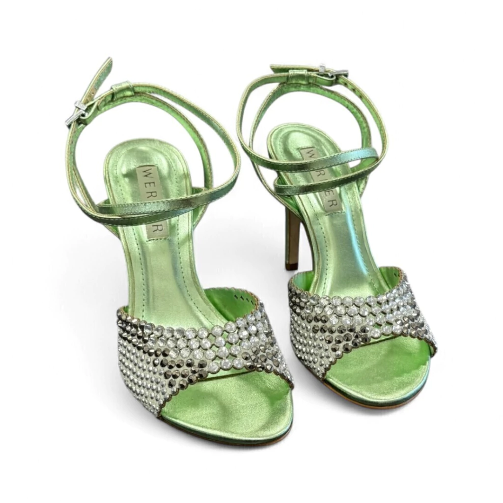 DESCRIÇÃO: A imagem mostra um par deslumbrante de sandálias com salto alto, em um elegante tom de verde metálico. O design apresenta tiras delicadas que se entrelaçam na parte dianteira, com uma faixa decorada com strass e detalhes em rebites que adicionam um toque glamouroso. O interior da sandália é em um verde vibrante, complementando o exterior. O salto é esguio, proporcionando altura e elegância. Essas sandálias são perfeitas para ocasiões especiais, unindo sofisticação e estilo de maneira encantadora.