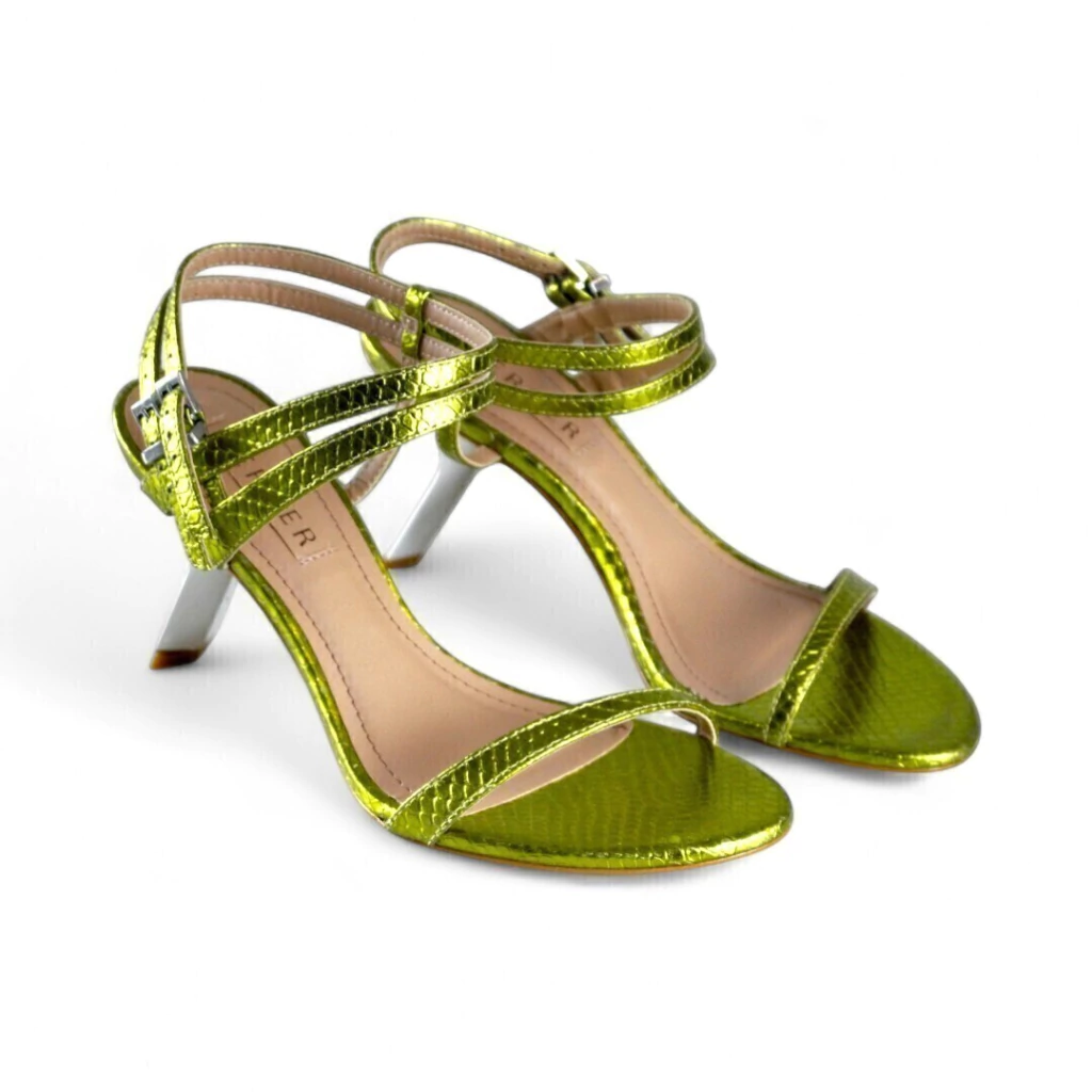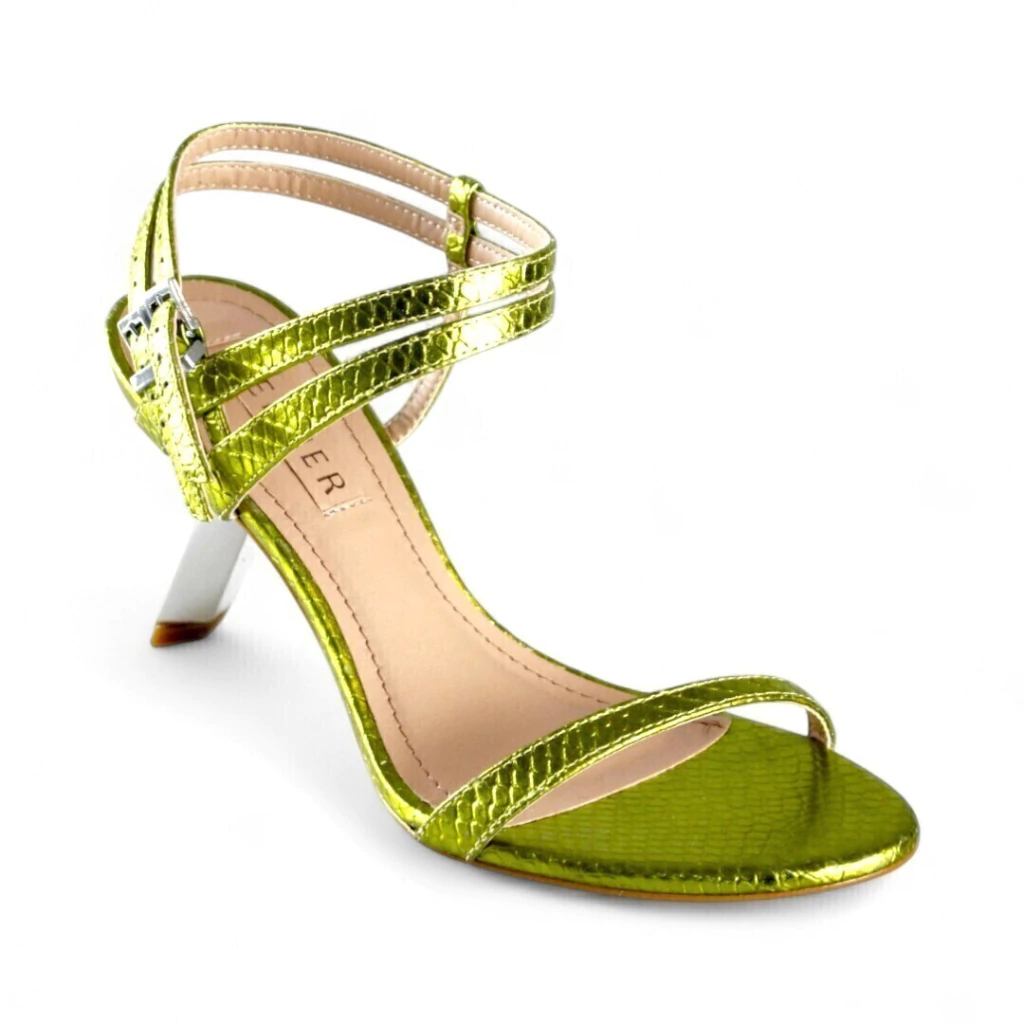 DESCRIÇÃO: Essa sandália verde metalizada é ousada e sofisticada, perfeita para quem gosta de destacar o visual com elegância. O modelo apresenta tiras finas e delicadas, com fechamento duplo no tornozelo que garante ajuste seguro e um toque moderno. O acabamento em textura metalizada traz brilho e personalidade, enquanto o salto fino de altura média valoriza a silhueta com leveza. Ideal para compor produções noturnas ou eventos especiais, essa sandália adiciona um toque vibrante e glamouroso a qualquer look.