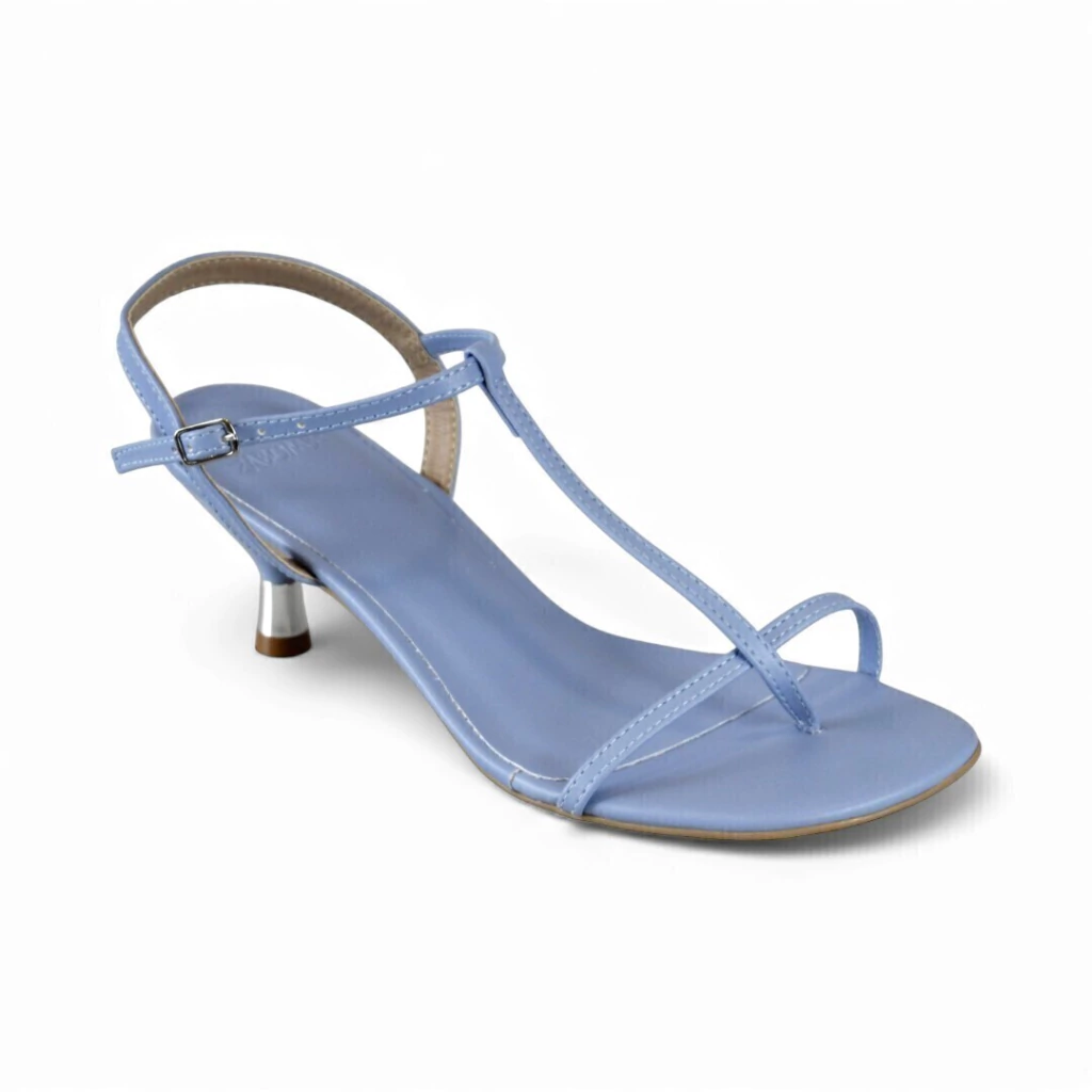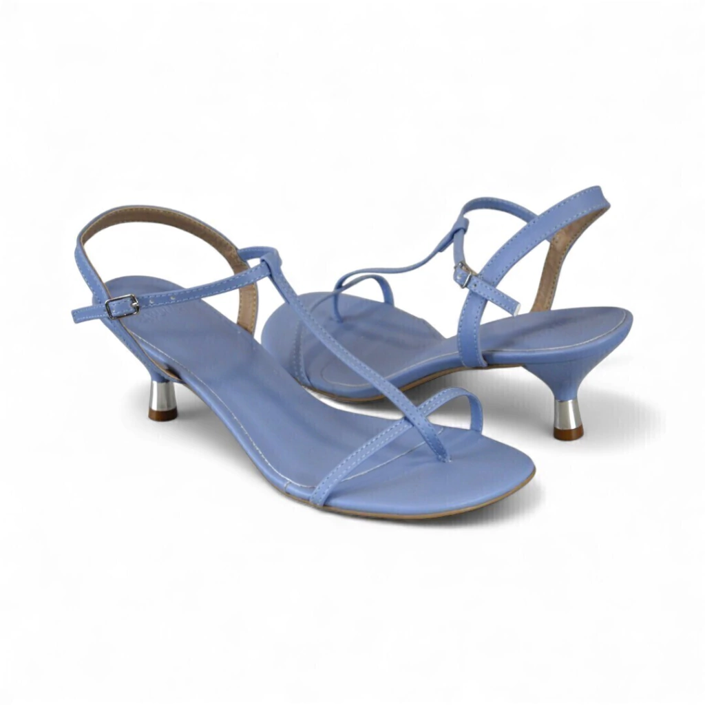 DESCRIÇÃO:Sandália feminina em tom azul claro/lavanda com tiras finíssimas: passante em T que liga à tira toe-loop sobre os dedos e tira de tornozelo com fivela prateada ajustável. Salto baixíssimo tipo kitten metálico com ponta marrom; palmilha na mesma tonalidade azul. Bico levemente quadrado.