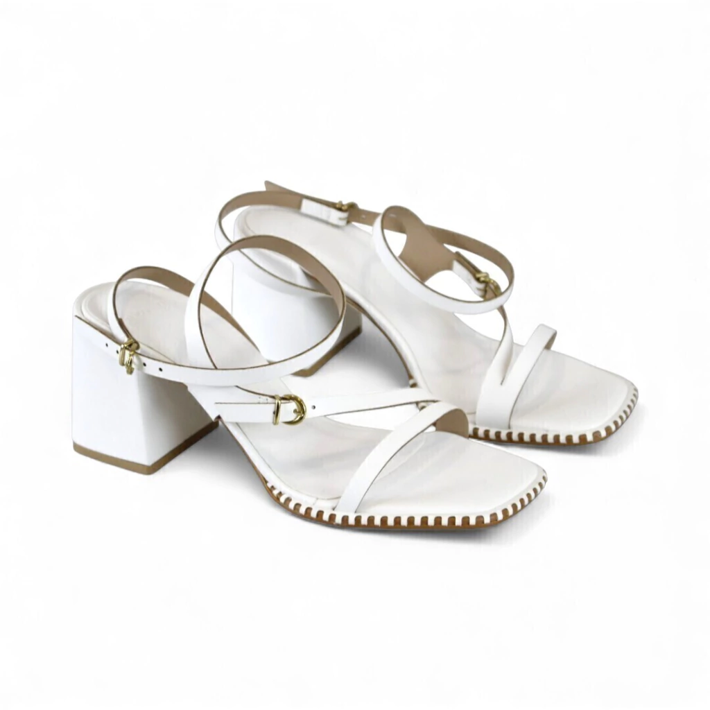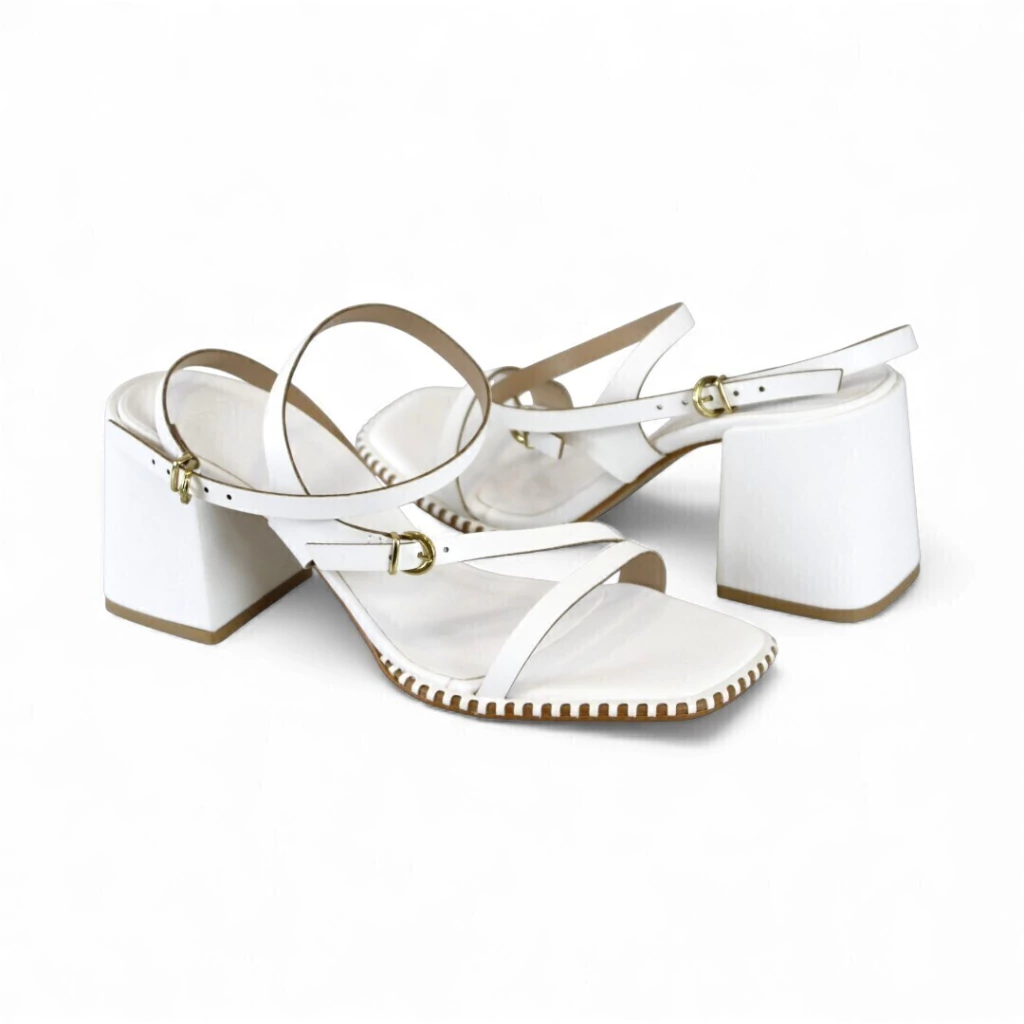 DESCRIÇÃO: Sandália feminina branca com bico quadrado e cabedal de tiras finas: uma sobre os dedos e tiras cruzadas no dorso que se prendem por fivela dourada lateral no tornozelo. Salto bloco médio; acabamento com costura decorativa aparente ao redor da borda da sola. Palmilha branca.