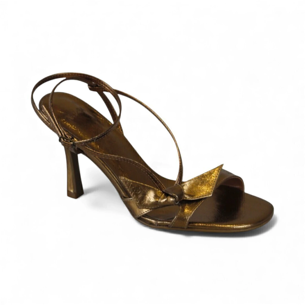 DESCRIÇÃO: Sandália feminina metalizada em tom bronze/dourado com bico quadrado aberto. Possui tira frontal larga com aplicação em bico triangular tipo laço/recorte sobre o antepé, e tira fina em toe-loop que prende os dedos. Tiras finas longas que contornam o tornozelo (wrap) formando nó lateral. Salto alto fino com base levemente quadrada revestida na mesma cor; palmilha e interior metalizados brilhantes. Sola com leve elevação frontal.