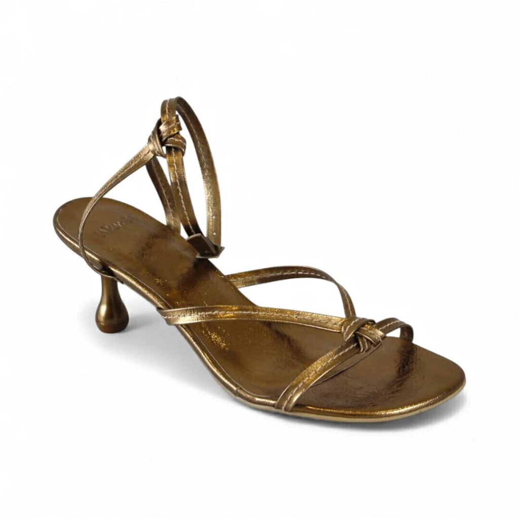 DESCRIÇÃO:Sandália feminina metalizada em tom bronze/dourado com tiras finas. Possui tira toe-loop sobre os dedos com nó decorativo, tiras em X no dorso que sobem até o tornozelo formando nó apoiando a tira de calcanhar; fechamento por fivela pequena ajustável. Bico levemente quadrado; salto tipo kitten arredondado em formato de gota na mesma tonalidade metálica. Palmilha e acabamento interno metalizados.