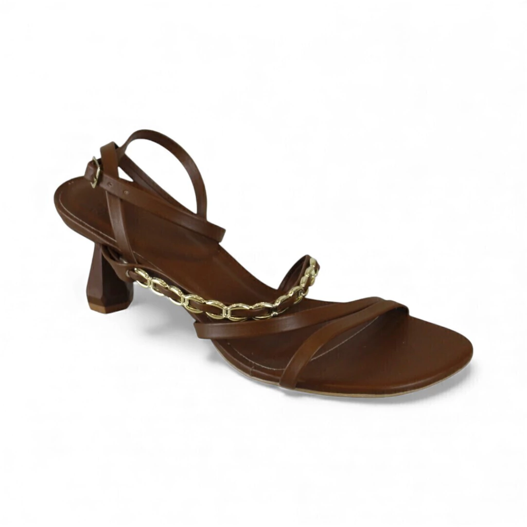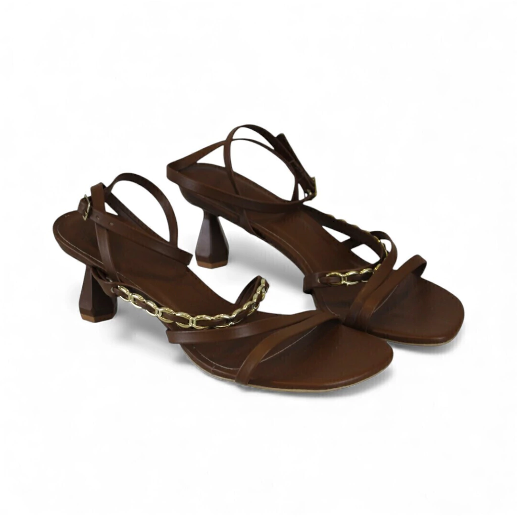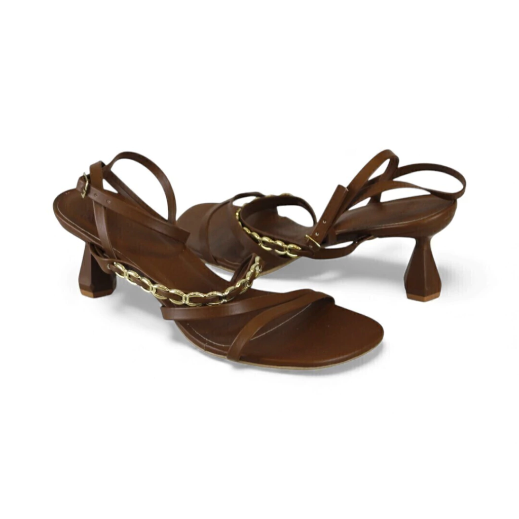 DESCRIÇÃO: Sandália feminina marrom com bico quadrado aberto. Possui tiras finas sobre o antepé e uma tira decorativa com corrente dourada sobre o peito do pé. Tira de tornozelo dupla com fivela lateral ajustável. Salto baixo em bloco com detalhe geométrico e palmilha marrom lisa; acabamento com costura discreta na borda da sola.