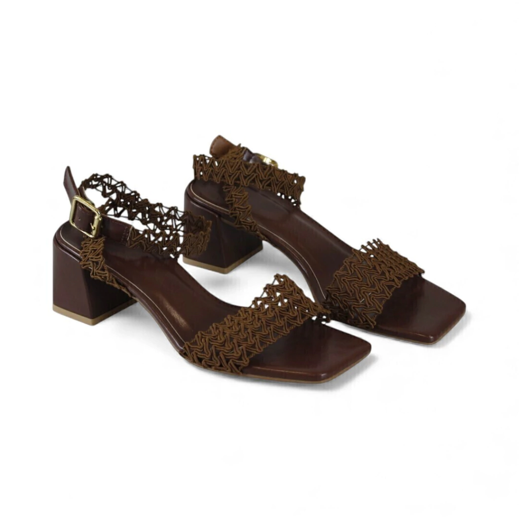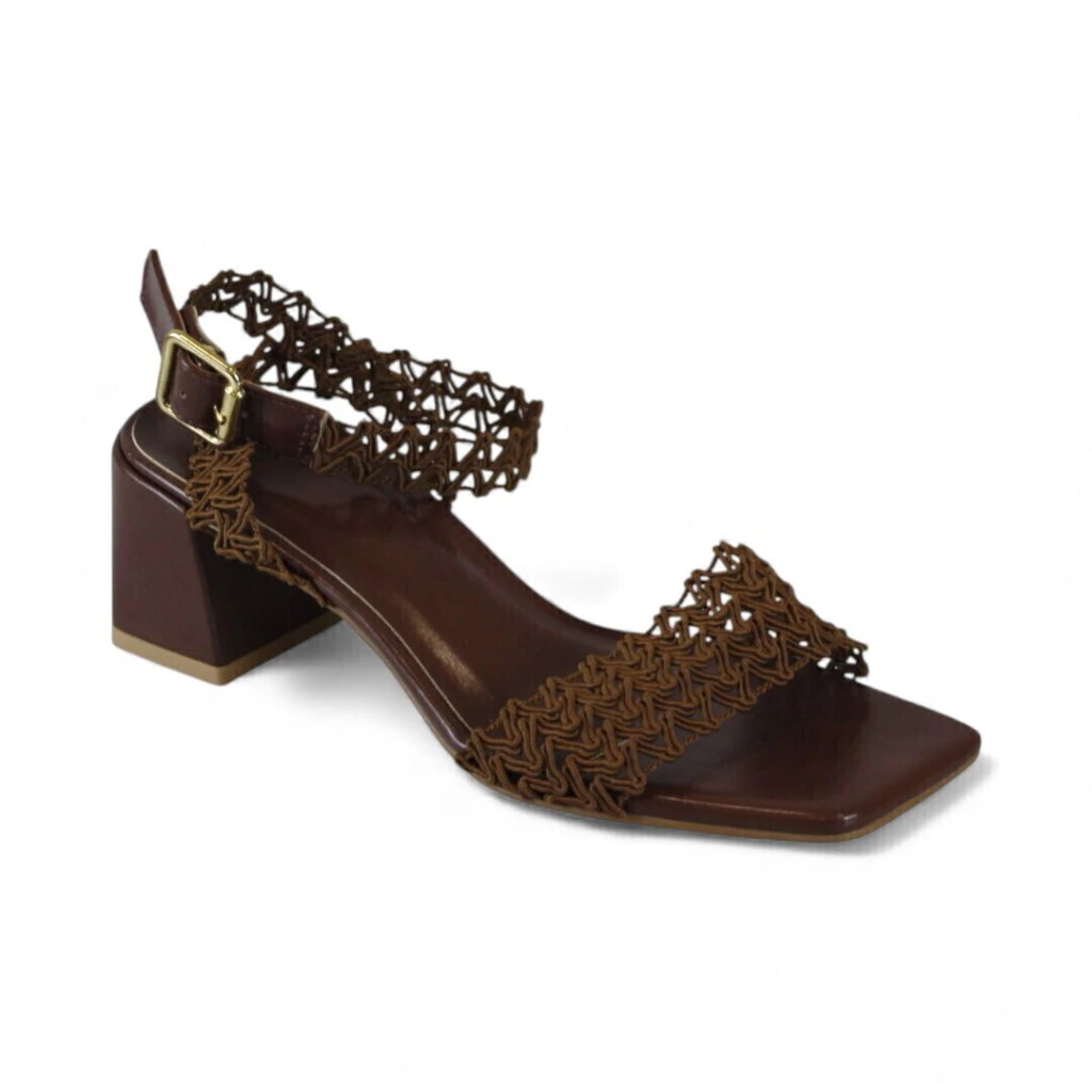 DESCRIÇÃO: Sandália feminina marrom com bico quadrado e acabamento liso. Possui duas tiras largas em técnica de macramê/entrelaçado (uma sobre o antepé e outra no tornozelo), conferindo aspecto artesanal. Tira de ajuste no calcanhar com fivela dourada lateral. Salto bloco médio em tom marrom, sola com filete discreto em contraste; palmilha marrom com brilho suave.