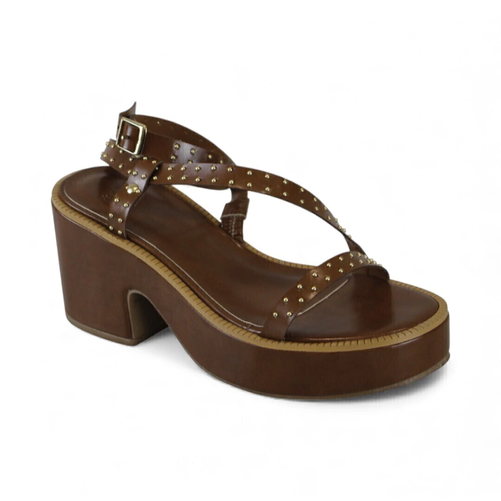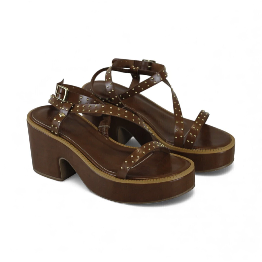 DESCRIÇÃO:Sandália feminina marrom em material tipo couro, com solado plataforma e salto quadrado alto integrado. Tiras finas cruzadas sobre o peito do pé e tira no tornozelo com fivela dourada ajustável. Tiras decoradas por pequenas tachas douradas. Bico aberto, palmilha acolchoada aparente e acabamento com costura visível na borda do solado.