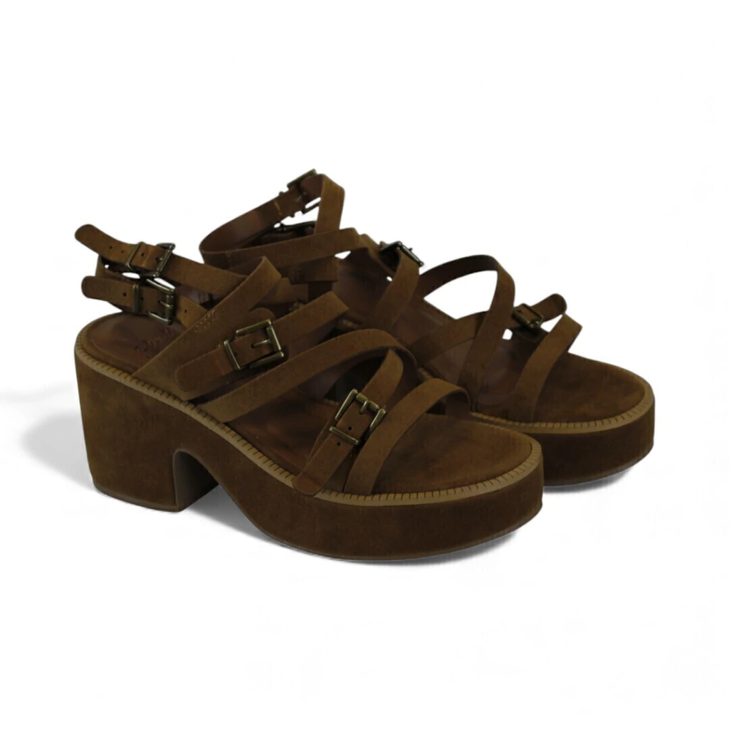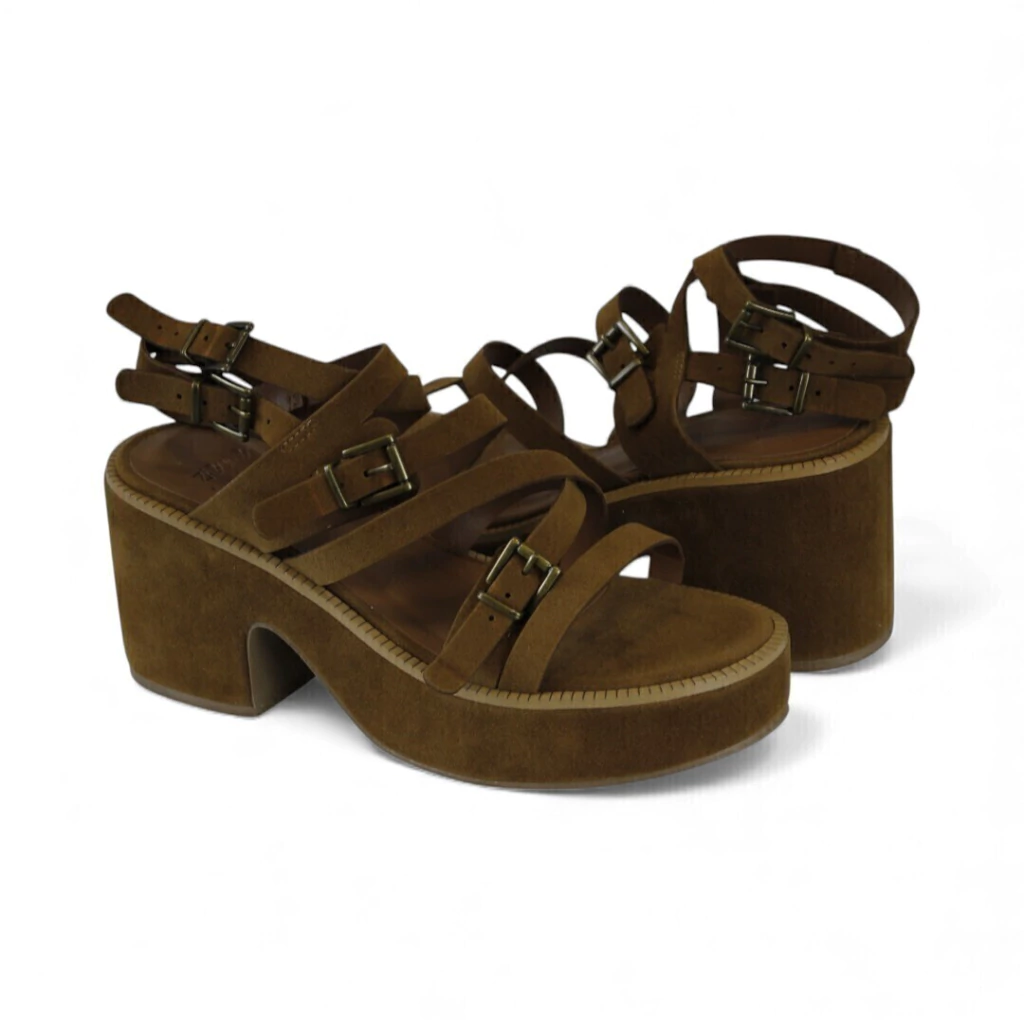 DESCRIÇÃO:Sandália feminina marrom em camurça, com solado plataforma e salto quadrado alto com recorte interno. Várias tiras horizontais sobre o peito do pé, cada uma com fivela metálica ajustável em tom dourado envelhecido; tira de tornozelo dupla com fivelas. Palmilha levemente acolchoada, bico arredondado e acabamento com costura visível na borda do solado.