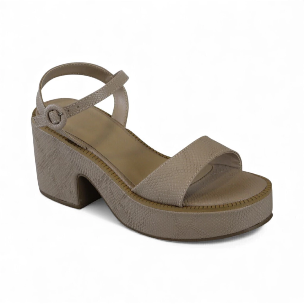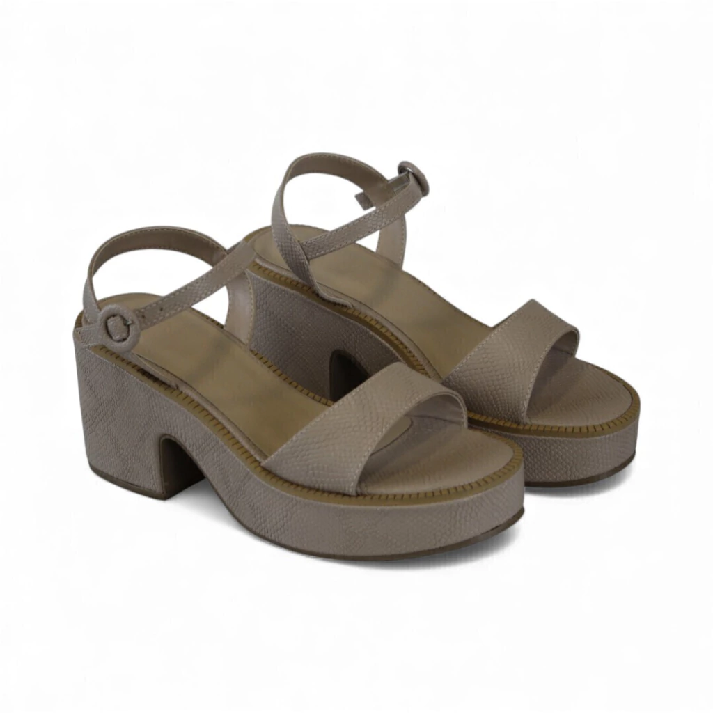 DESCRIÇÃO: Sandália feminina em tom bege claro com acabamento que lembra textura de pelica. Solado plataforma alto com salto quadrado e recorte interno. Tira larga sobre os dedos e tira no tornozelo com fivela circular forrada no mesmo material. Palmilha levemente acolchoada, bico arredondado e costura decorativa na borda do solado.