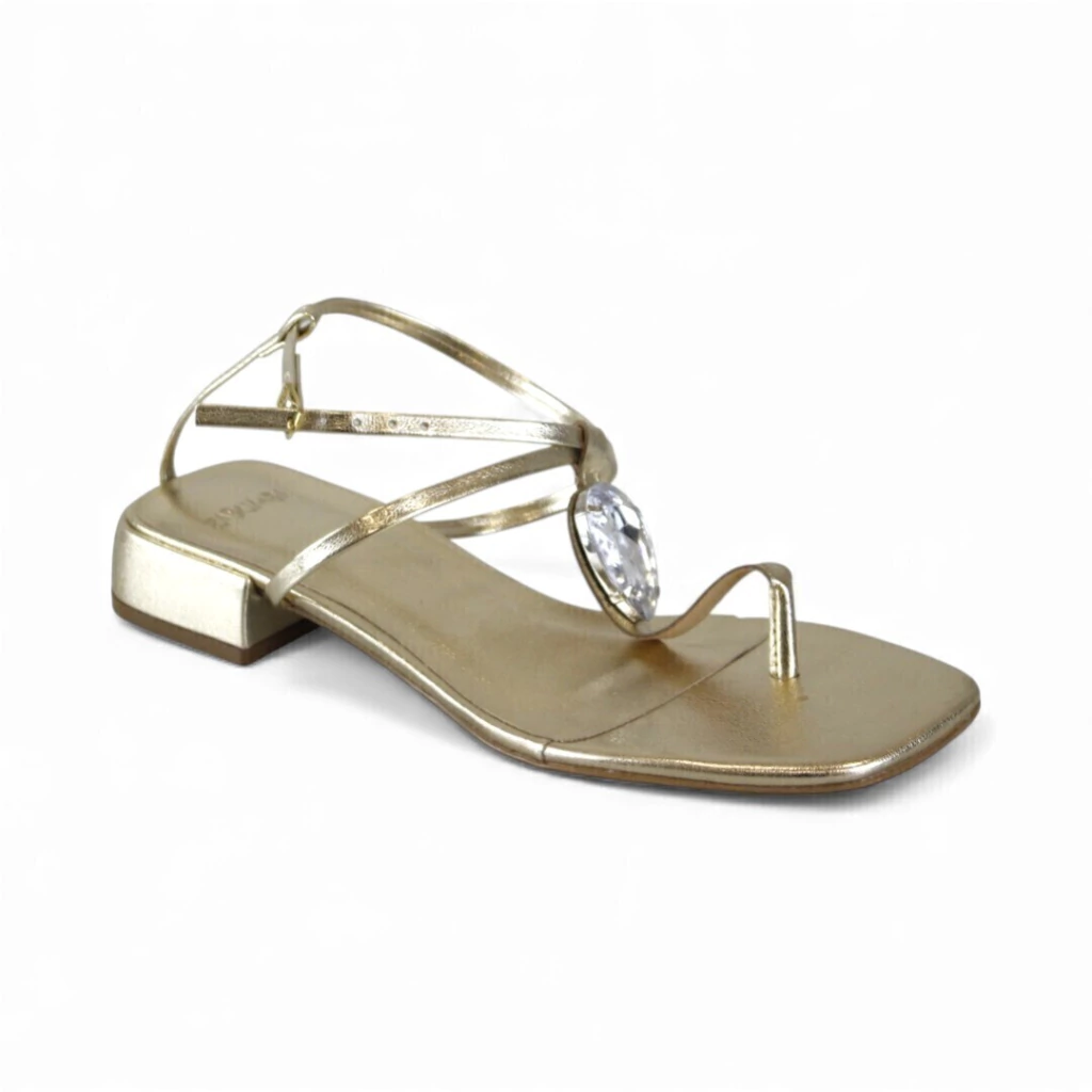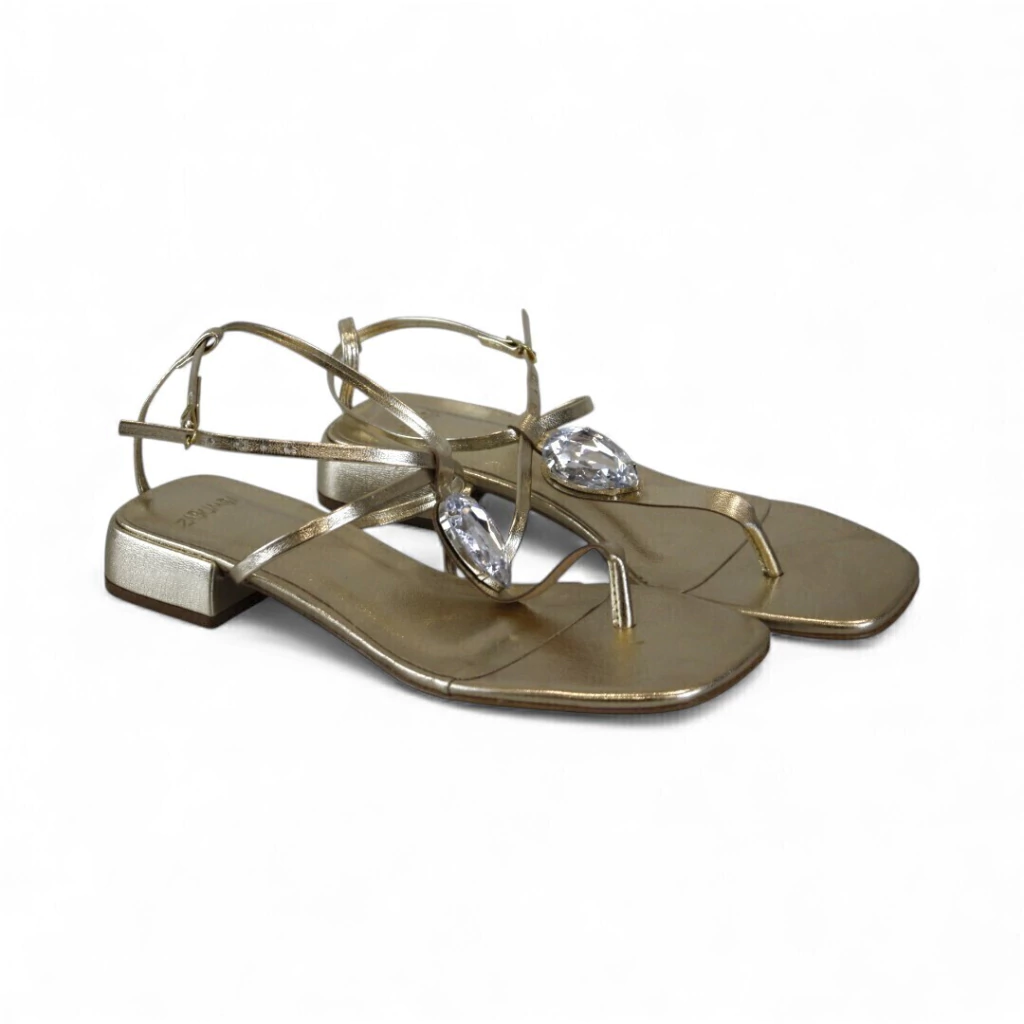 DESCRIÇÃO: Sandália metalizada dourada com bico quadrado aberto. Modelo com toe-loop (argolinha para o dedão) e tiras finas cruzadas sobre o peito do pé e no tornozelo, com fechamento por fivela lateral. Aplicação central grande em formato de gota/pedra cristal translúcida posicionada sobre o peito do pé. Salto bloco baixo revestido na mesma cor; palmilha dourada lisa com leve brilho. Sola com borda discreta.