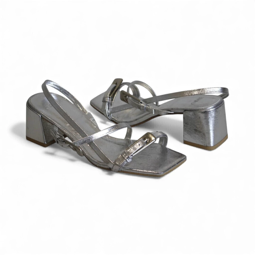 DESCRIÇÃO: Sandália feminina metalizada prateada com bico quadrado. Possui tiras finas cruzando o dorso e tira traseira tipo slingback; tira toe-loop na frente com detalhe metálico retangular dourado/prateado sobre o pé. Salto bloco médio baixo revestido na mesma cor; palmilha e acabamento brilhantes. Sola com borda fina em tom contrastante.