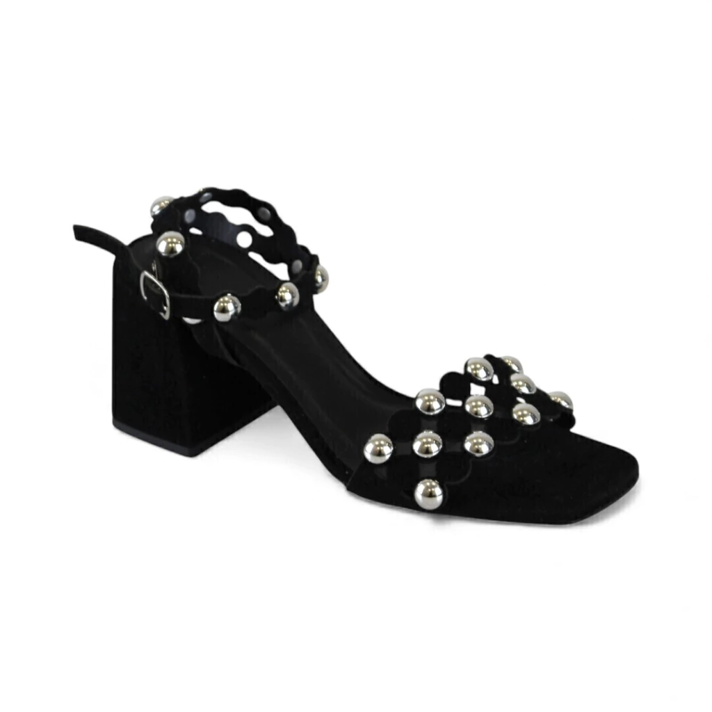 DESCRIÇÃO: Sandália feminina preta em material tipo camurça com bico quadrado aberto. Possui duas tiras frontais recortadas em ondas/escalope decoradas por tachas/bolinhas metálicas prateadas e tira de tornozelo com fivela lateral ajustável também com recorte escalope. Salto bloco médio alto revestido em preto; palmilha preta lisa. Sola com leve borda em contraste.