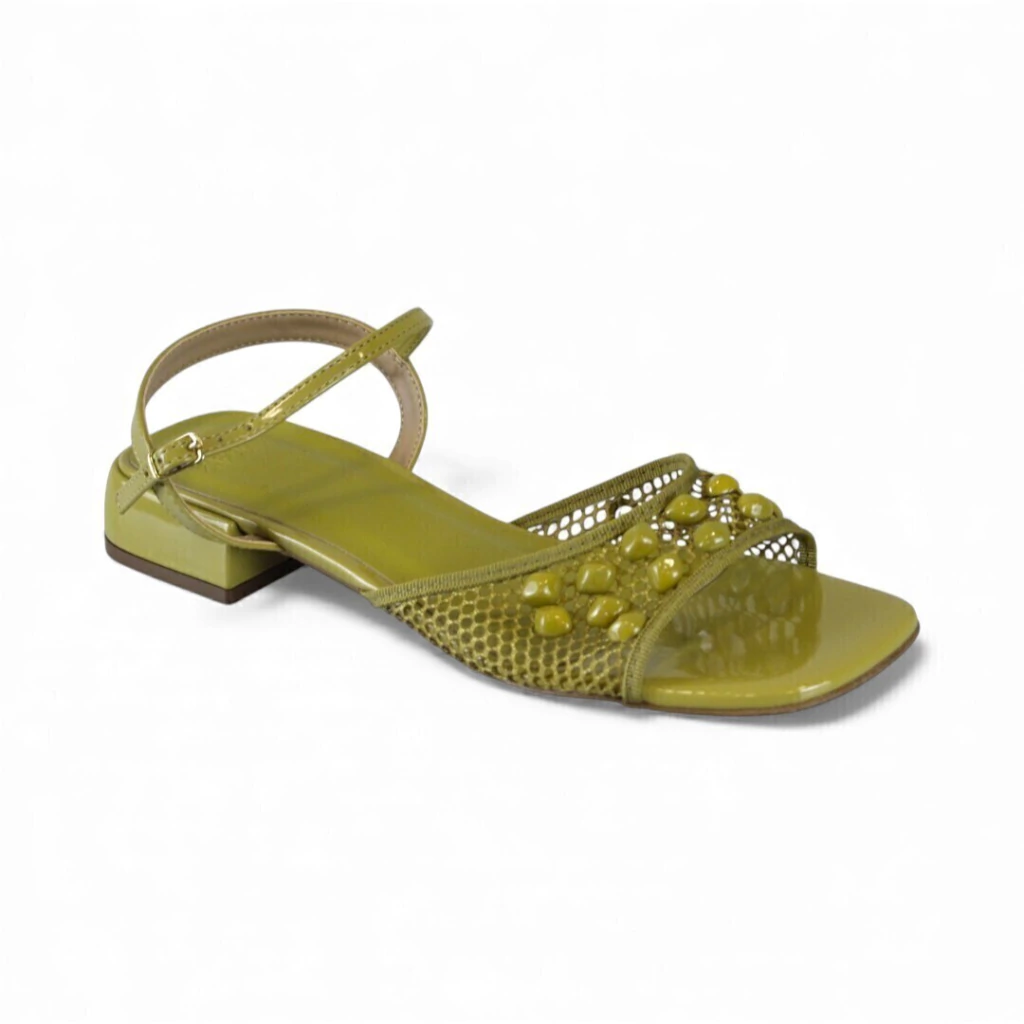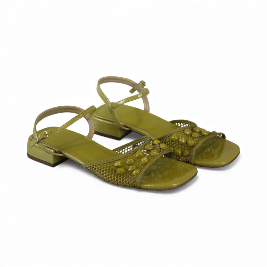 DESCRIÇÃO: Sandália feminina verde-oliva em verniz com bico quadrado aberto. Possui pala frontal em mesh/miçangas com aplicações em relevo no mesmo tom, e tira de tornozelo fina com fivela dourada ajustável. Salto bloco baixo levemente quadrado revestido; palmilha brilhante combinando com o verniz. Sola com borda fina em marrom.