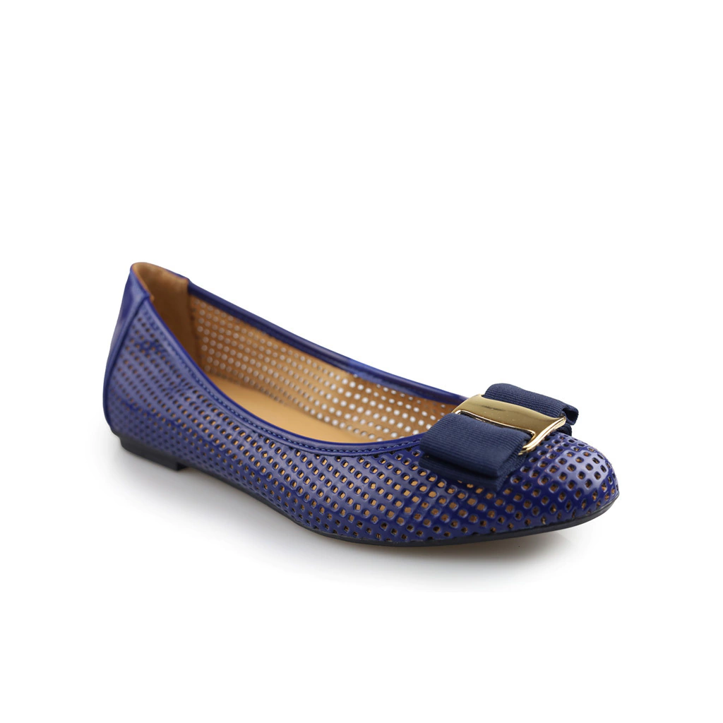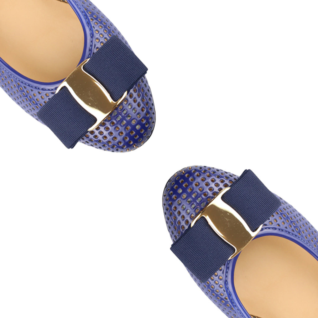 Esta sapatilha é uma opção elegante e confortável, apresentada em um tom azul profundo. Com um design de material perfurado, ela permite a ventilação, ideal para dias quentes. O detalhe de um laço em fita na parte frontal, com um fecho dourado, adiciona um toque sofisticado.