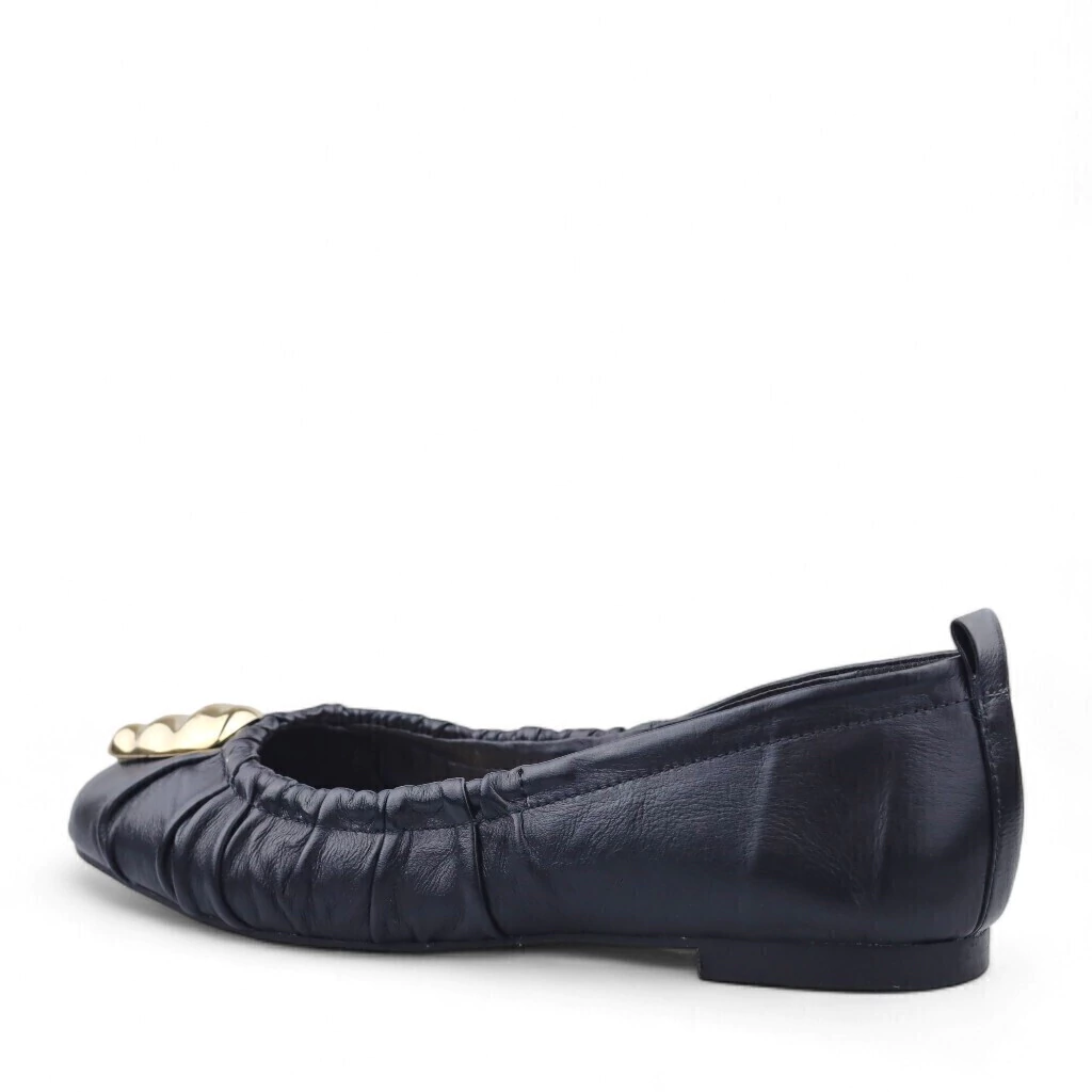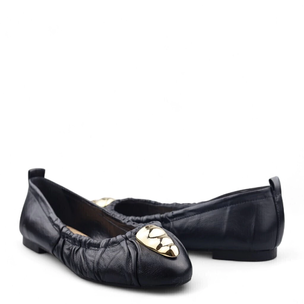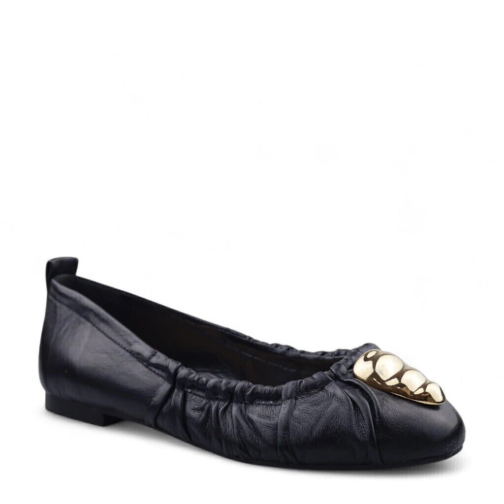 DESCRIÇÃO: A imagem apresenta um par de sapatilhas em um elegante tom preto. O design é casual e confortável, com um formato arredondado na ponta e um detalhe em forma de esferas metálicas na parte frontal, que adiciona um toque de sofisticação. A superfície é levemente texturizada, conferindo um ar descontraído ao modelo. A parte superior é elástica, permitindo um ajuste confortável ao pé. Com um solado baixo, essas sapatilhas são ideais para o uso diário, proporcionando estilo e conforto para diversas ocasiões.