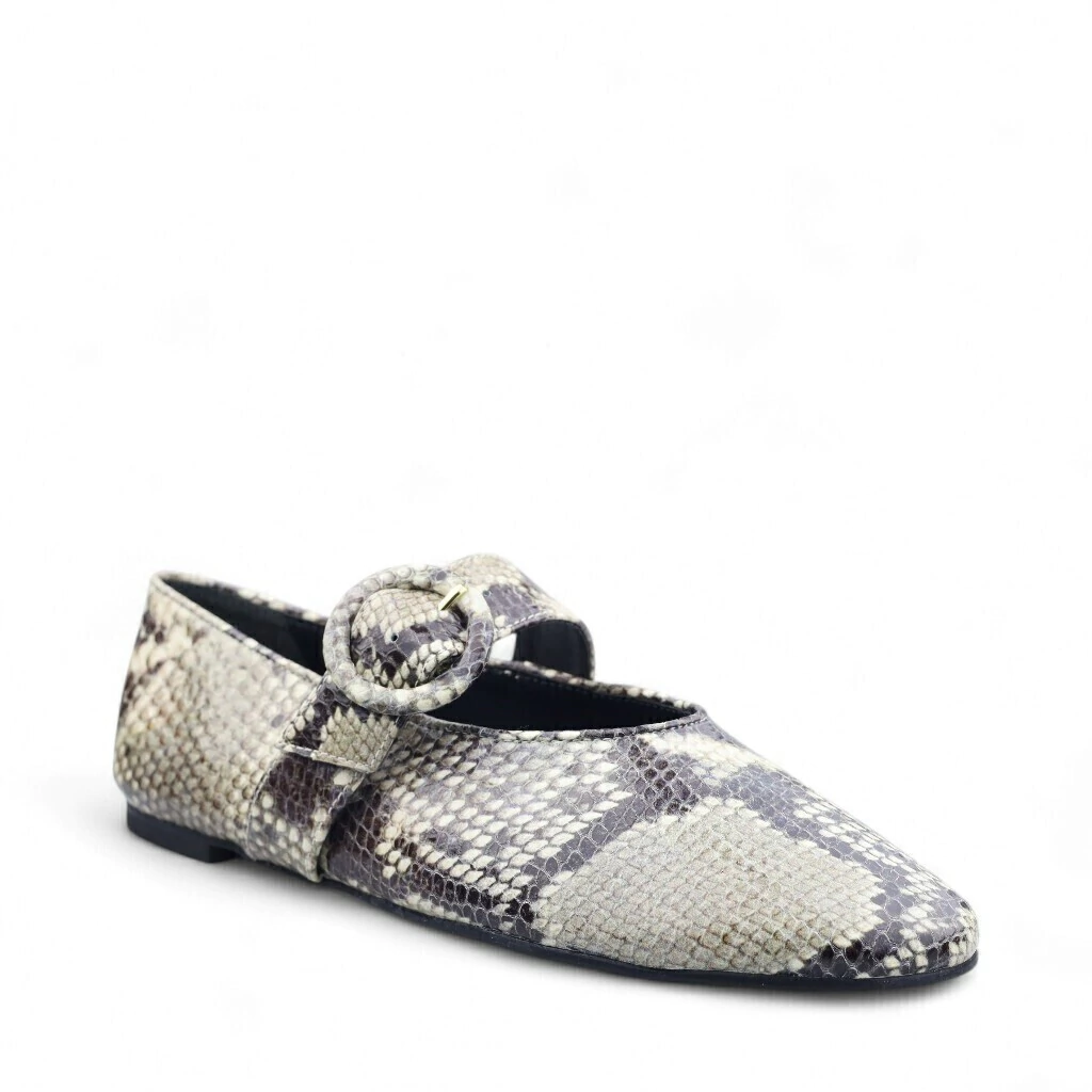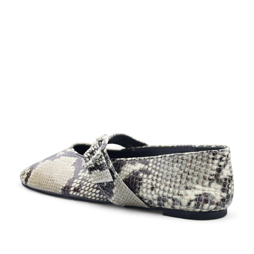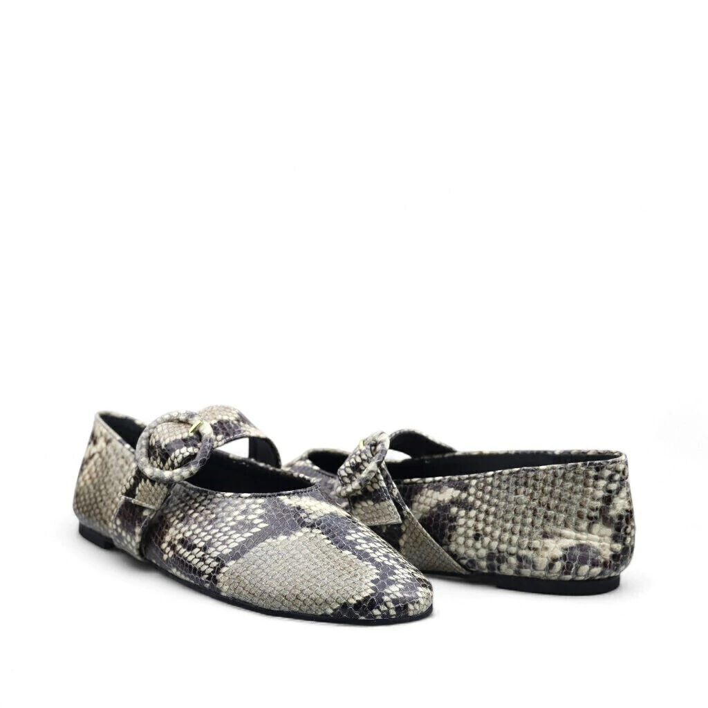 Descrição: A imagem mostra um sapato rasteiro com estampa de pele de cobra, em tons de cinza e marrom. O design é elegante, com um recorte na parte frontal e uma tira que se cruza, presa por um detalhe em forma de fivela redonda. O solado é plano, proporcionando conforto. Este modelo é ideal para quem busca um toque sofisticado e moderno, e o fundo branco destaca sua textura e estilo.