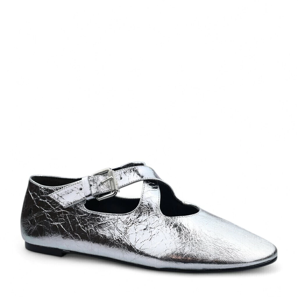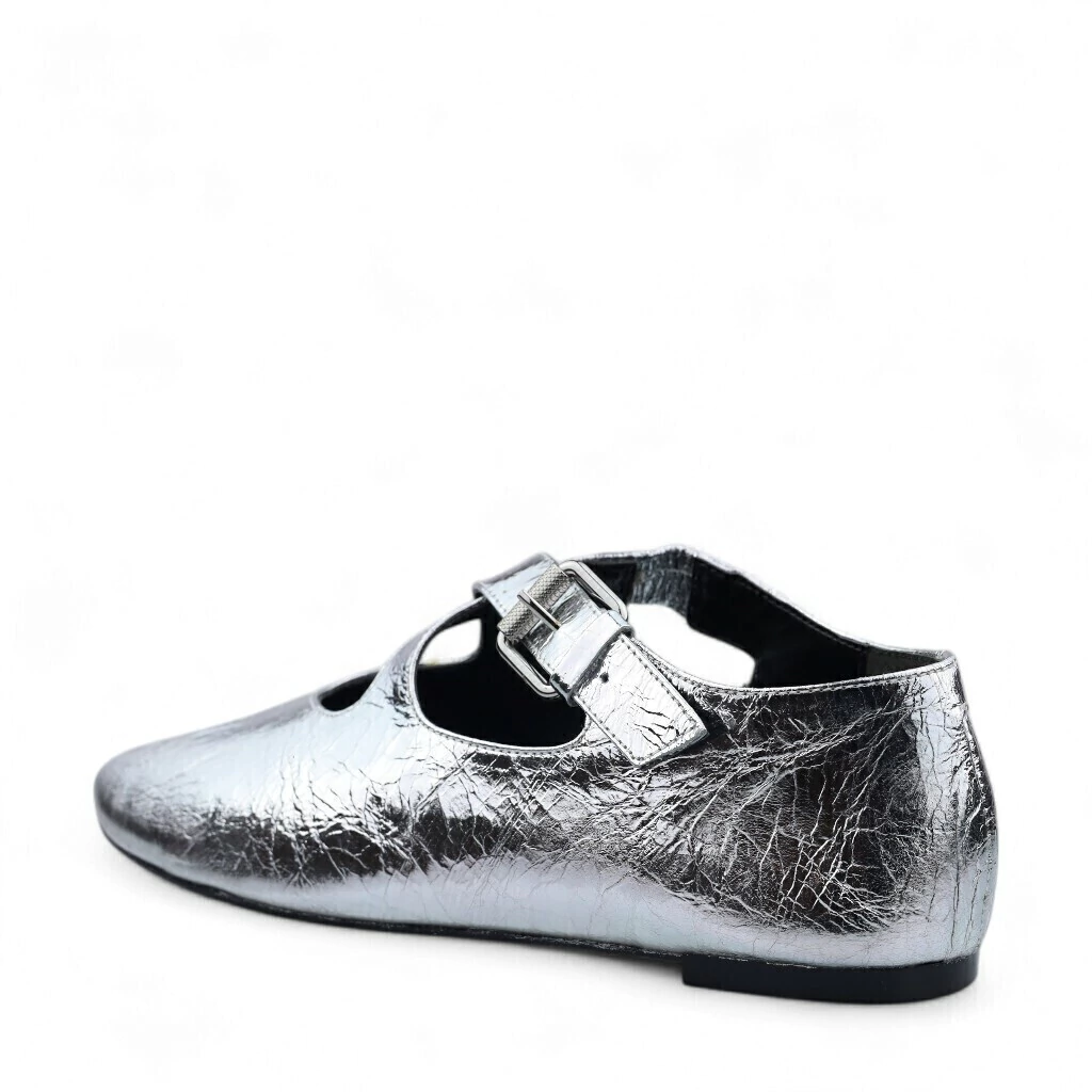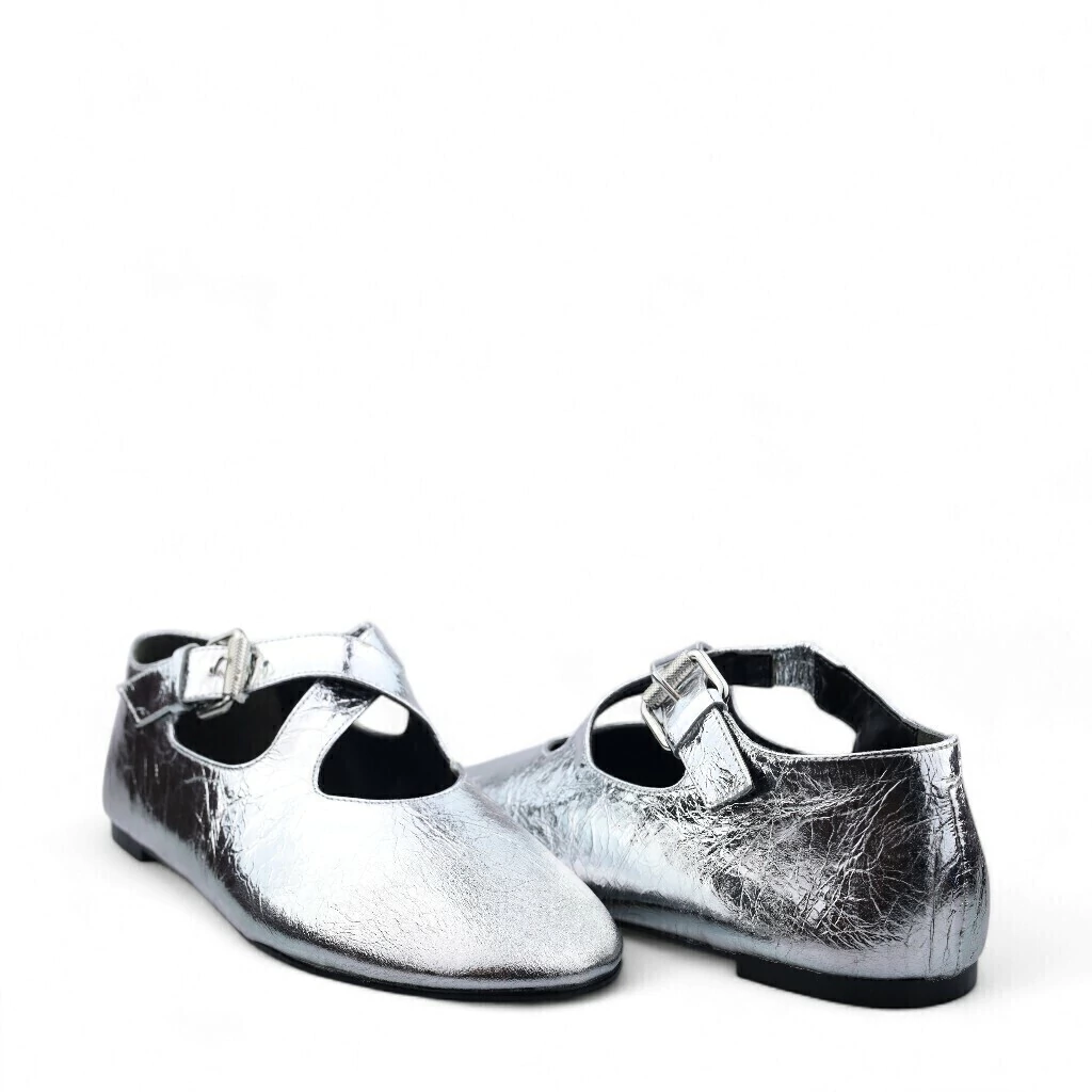 Descrição: A imagem mostra um sapato rasteiro prateado metálico, com acabamento brilhante. O design tem um recorte em "V" na frente e uma tira cruzada no peito do pé, presa por um fecho lateral. O solado é plano, garantindo conforto. Ideal para ocasiões variadas, o fundo branco destaca a modernidade do modelo.