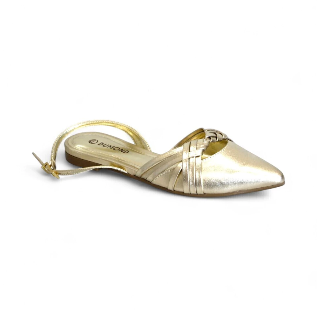 DESCRIÇÃO: Sandália Dumond dourada metalizada com bico fino e tiras trançadas na parte frontal. Possui tira ajustável no calcanhar com fivela dourada, garantindo conforto e segurança. Elegante e moderna, é ideal para compor looks sofisticados em ocasiões especiais.