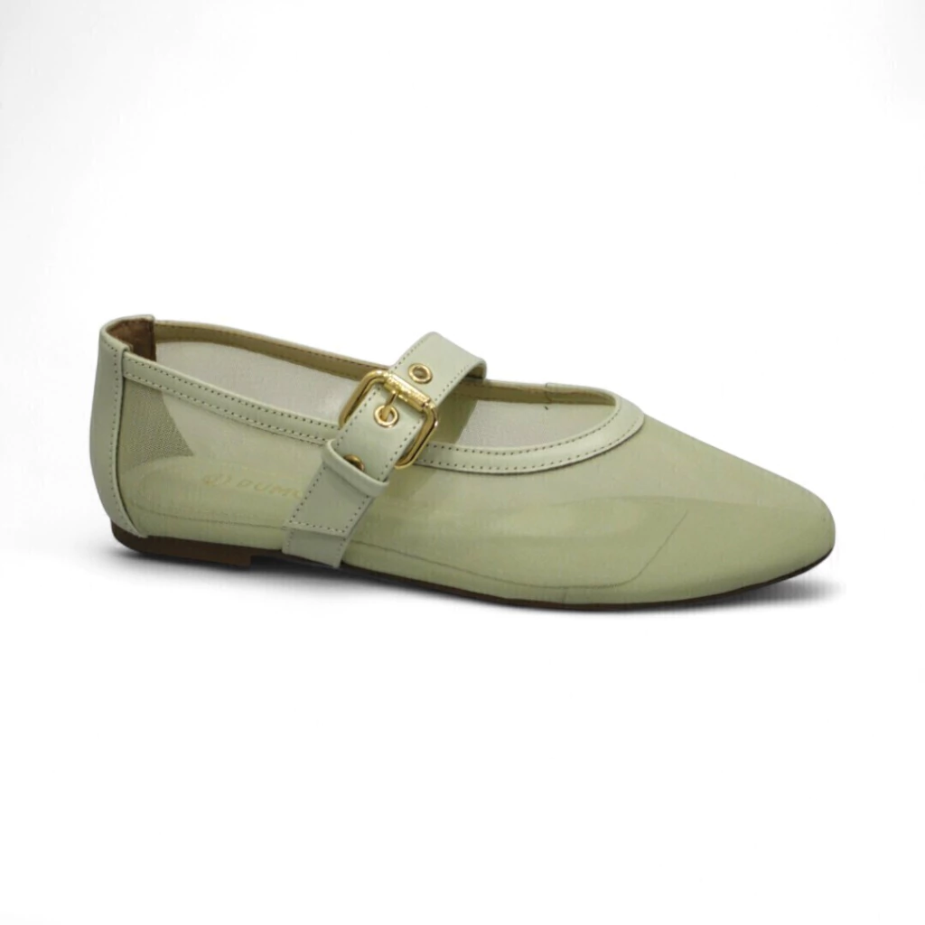 DESCRIÇÃO: Sapatilha verde clara estilo Mary Jane, com laterais em tela translúcida e fivela dourada. Possui bico levemente afinado e solado baixo, unindo conforto e delicadeza em um visual moderno e versátil.