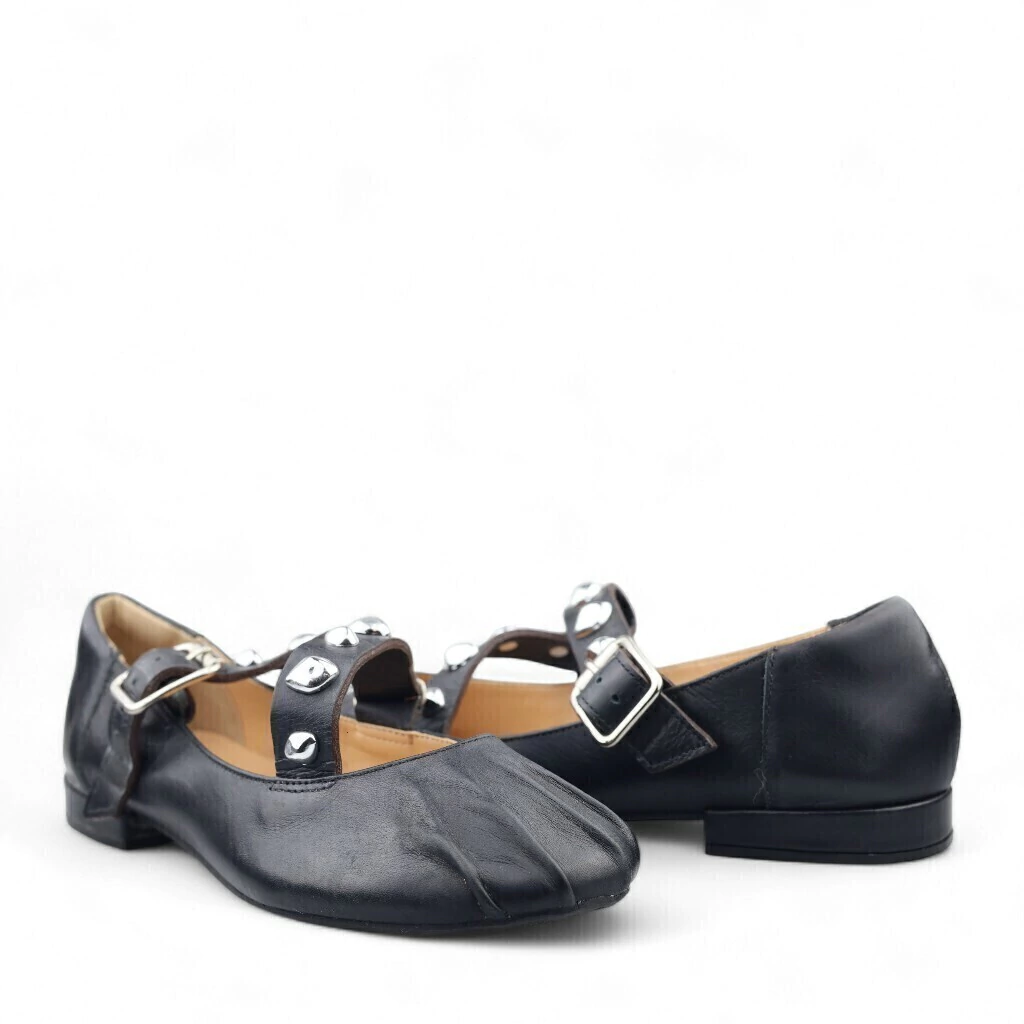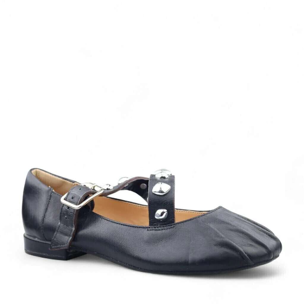 DESCRIÇÃO: A imagem mostra um sapato flat em um tom preto, com um design único e moderno. O modelo possui uma silhueta semelhante a uma sapatilha, mas se destaca por detalhes distintos, como a ponteira que apresenta um leve formato afunilado.