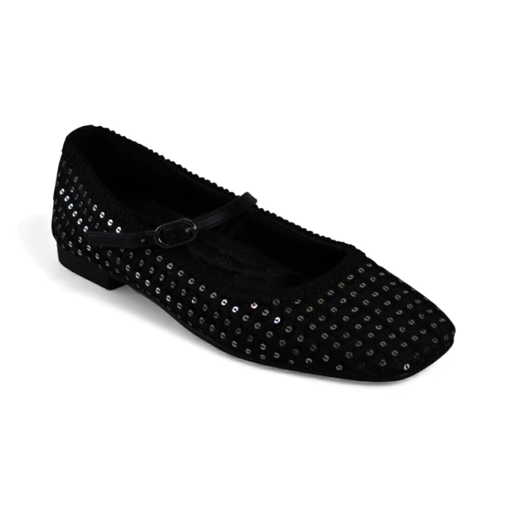 DESCRIÇÃO: Sapatilha feminina preta estilo Mary Jane com bico levemente quadrado e tira frontal com fivela pequena. Cabedal em tecido trançado/aveludado revestido por pequenos paetês/preta brilhante formando padrão uniforme. Borda superior com acabamento canelado, forro interno escuro e solado/mini salto baixos. Visual festivo e delicado.