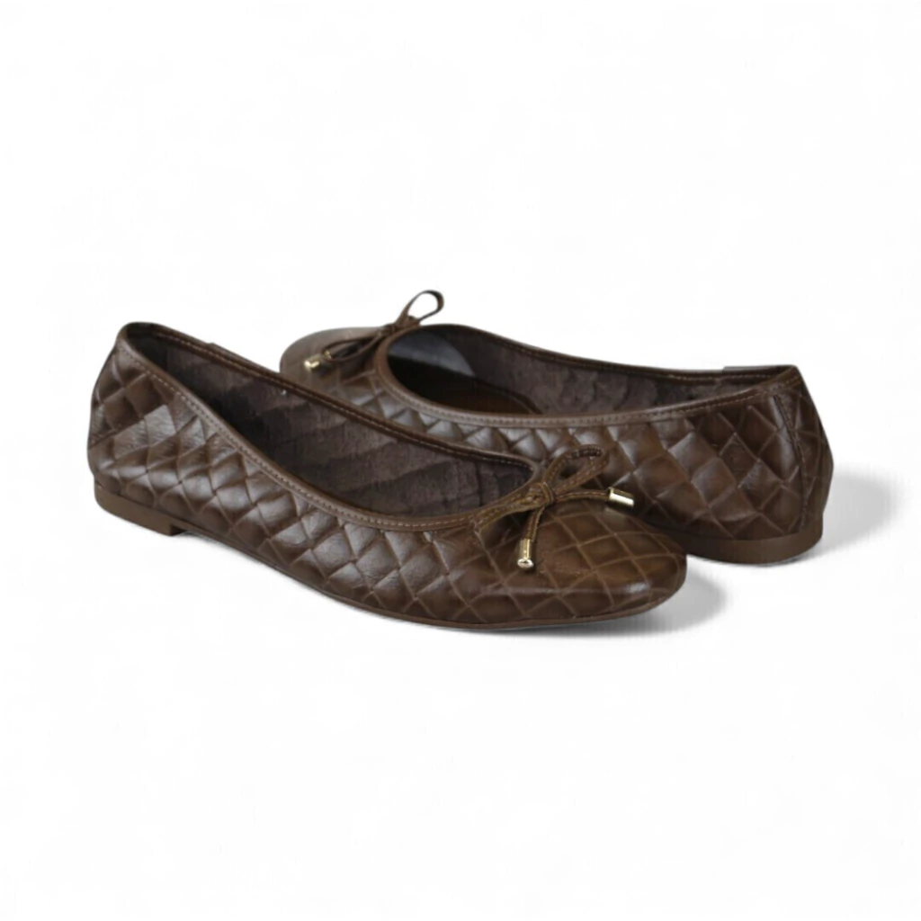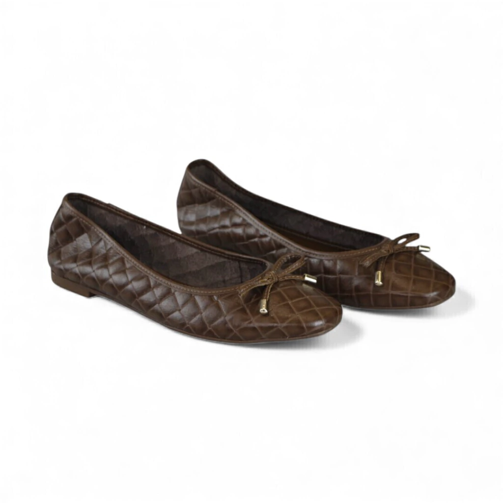DESCRIÇÃO: Sapatilha marrom em material acolchoado com matelassê, bico arredondado, laço decorativo com ponteiras metálicas douradas e solado baixo e plano.