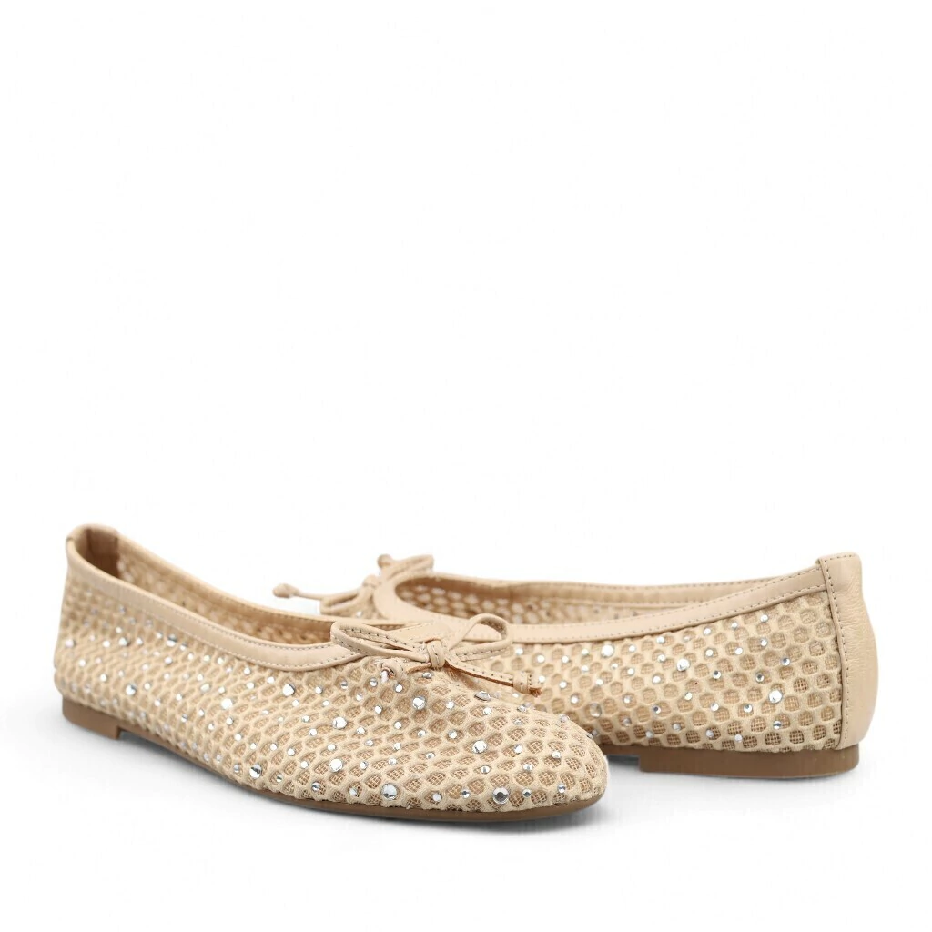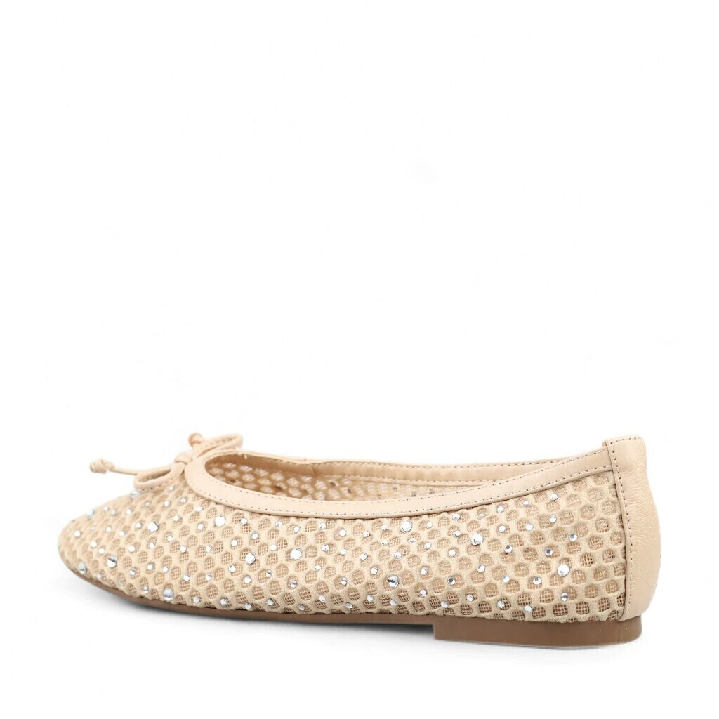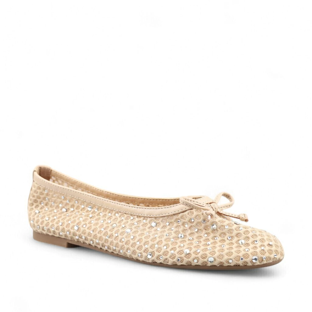 DESCRIÇÃO: A imagem apresenta uma sapatilha em tom nude, com um design delicado e sofisticado. A parte superior é feita de um material em rede, adornada com pequenas pedrinhas brilhantes que acrescentam um toque de glamour ao calçado. O bico é arredondado e há um laço sutil na parte frontal, que complementa o visual feminino. A sola é plana, garantindo conforto para o uso diário. Esta sapatilha é ideal para ocasiões casuais ou semi-formais, podendo ser combinada com saias, vestidos ou calças, trazendo um toque de elegância e charme ao visual.