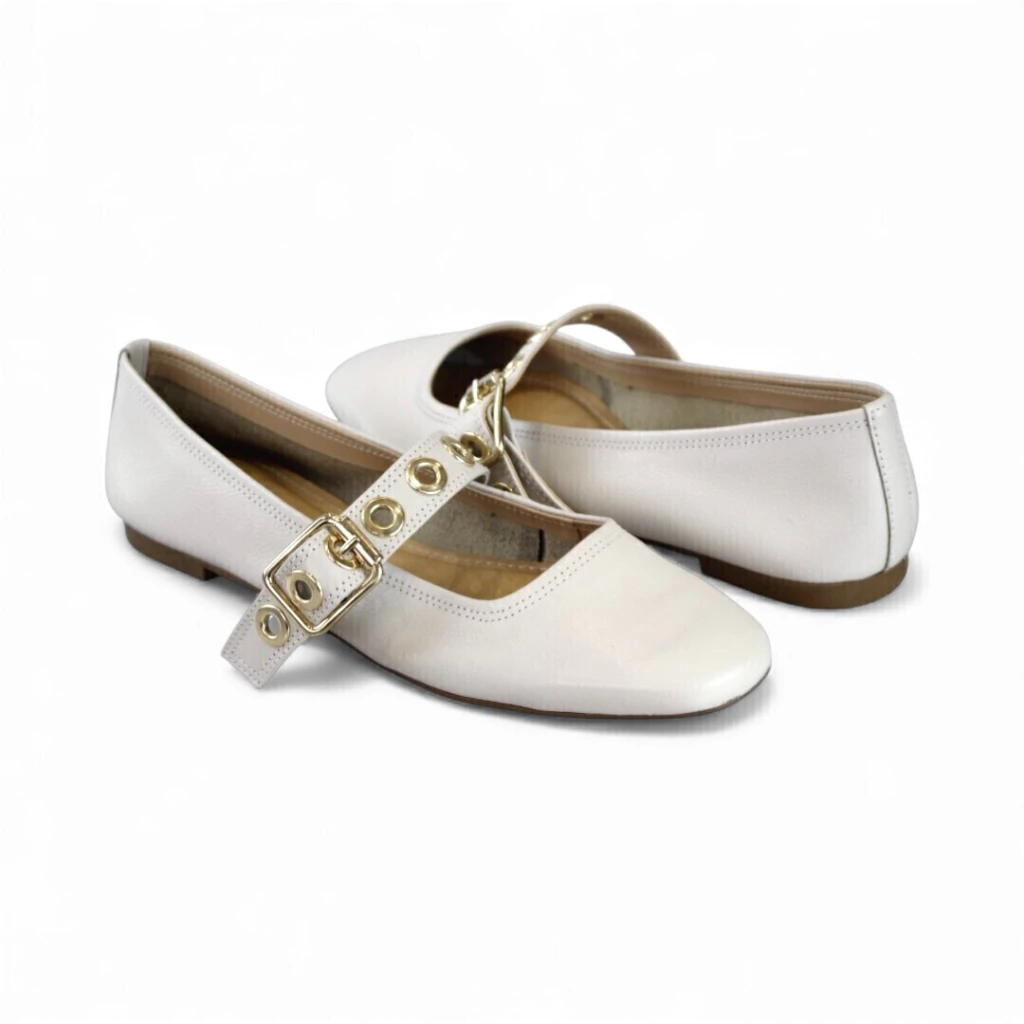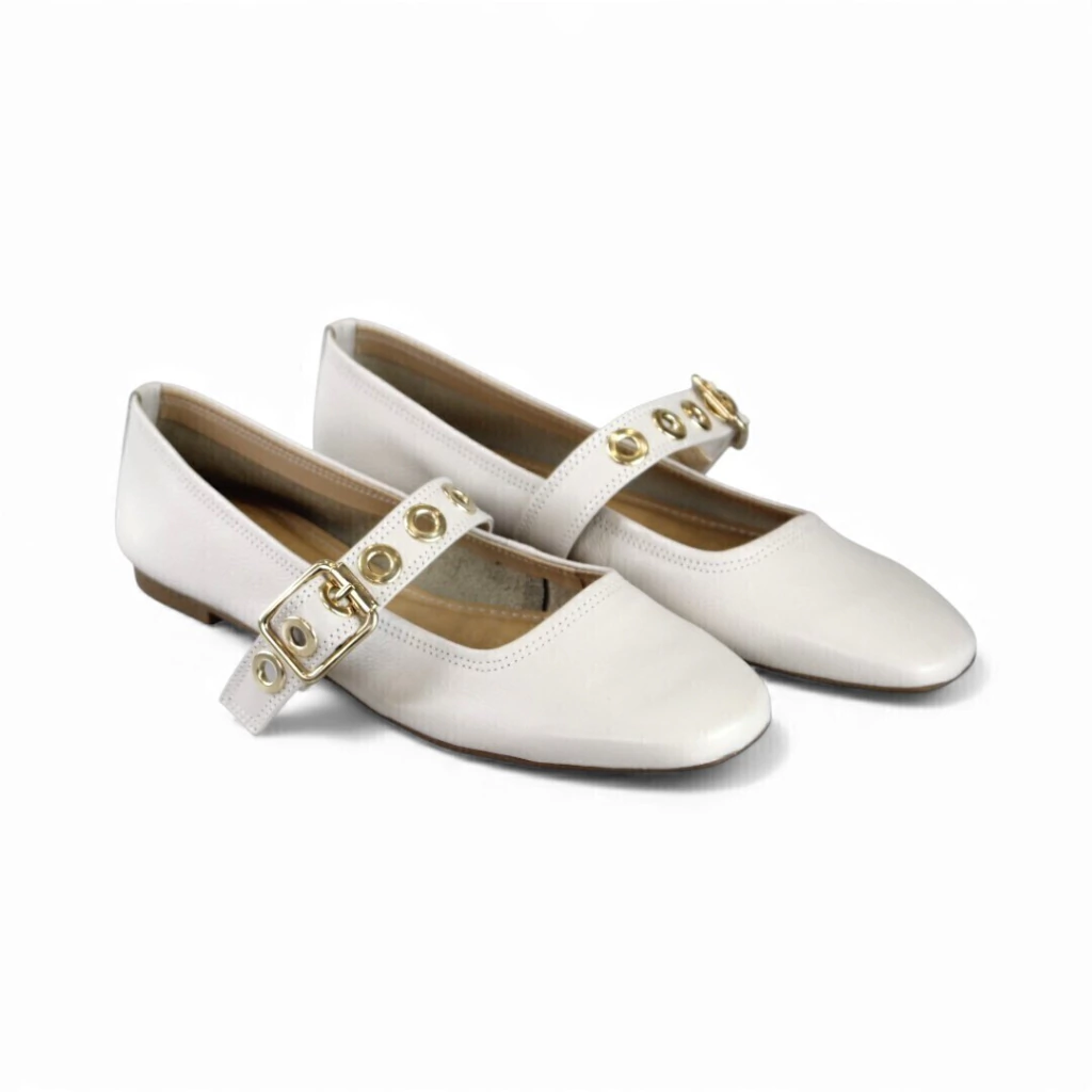DESCRIÇÃO: Sapatilha branca/off-white em couro com bico quadrado, modelo Mary Jane com tira no peito do pé; detalhe de fivela grande e ilhoses dourados, costura discreta e solado baixo e plano.