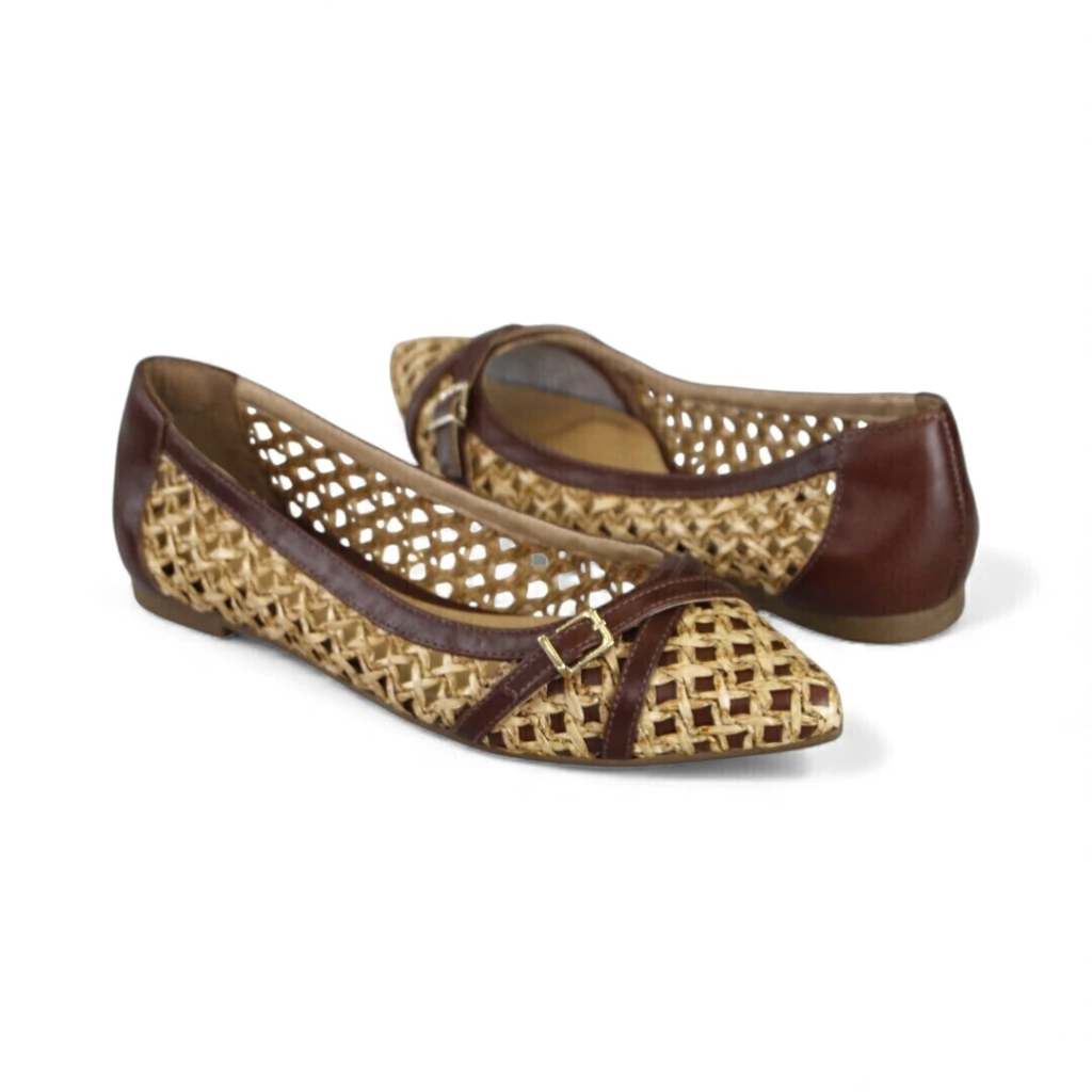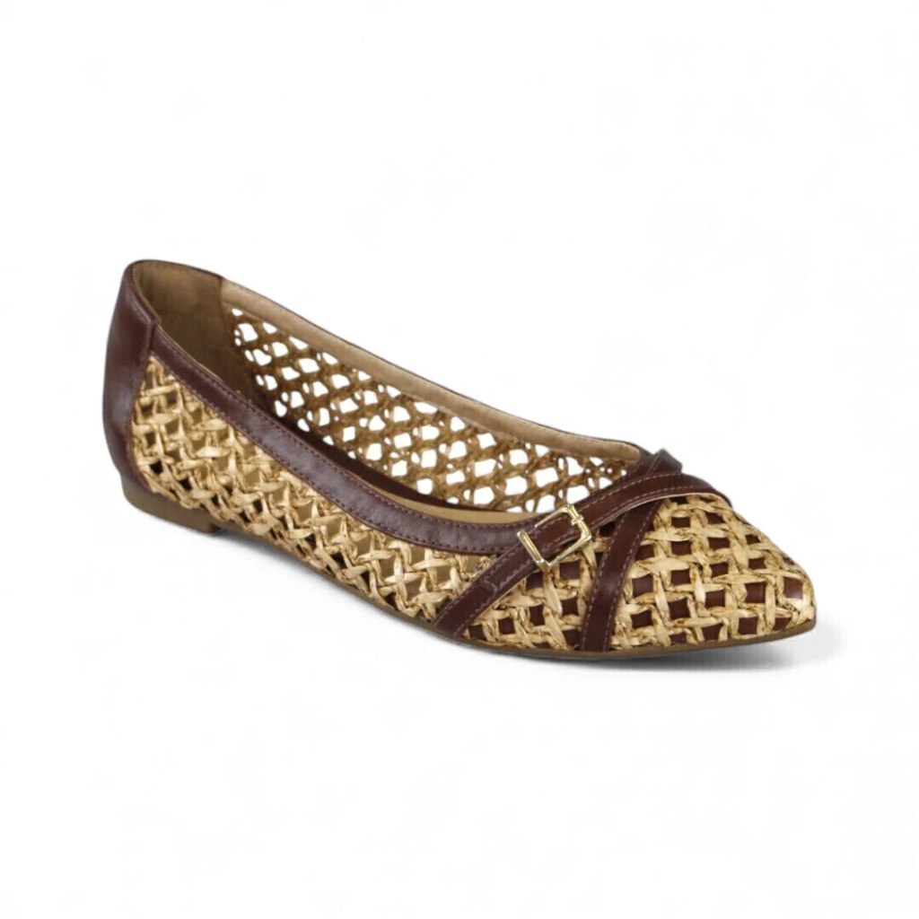 DESCRIÇÃO:Sapatilha feminina de bico levemente pontudo com corpo em tecido tramado/rafia em tom natural, acabamento em couro marrom escuro nas laterais e bico, tiras cruzadas com pequena fivela decorativa dourada, laterais vazadas e solado baixo e plano.