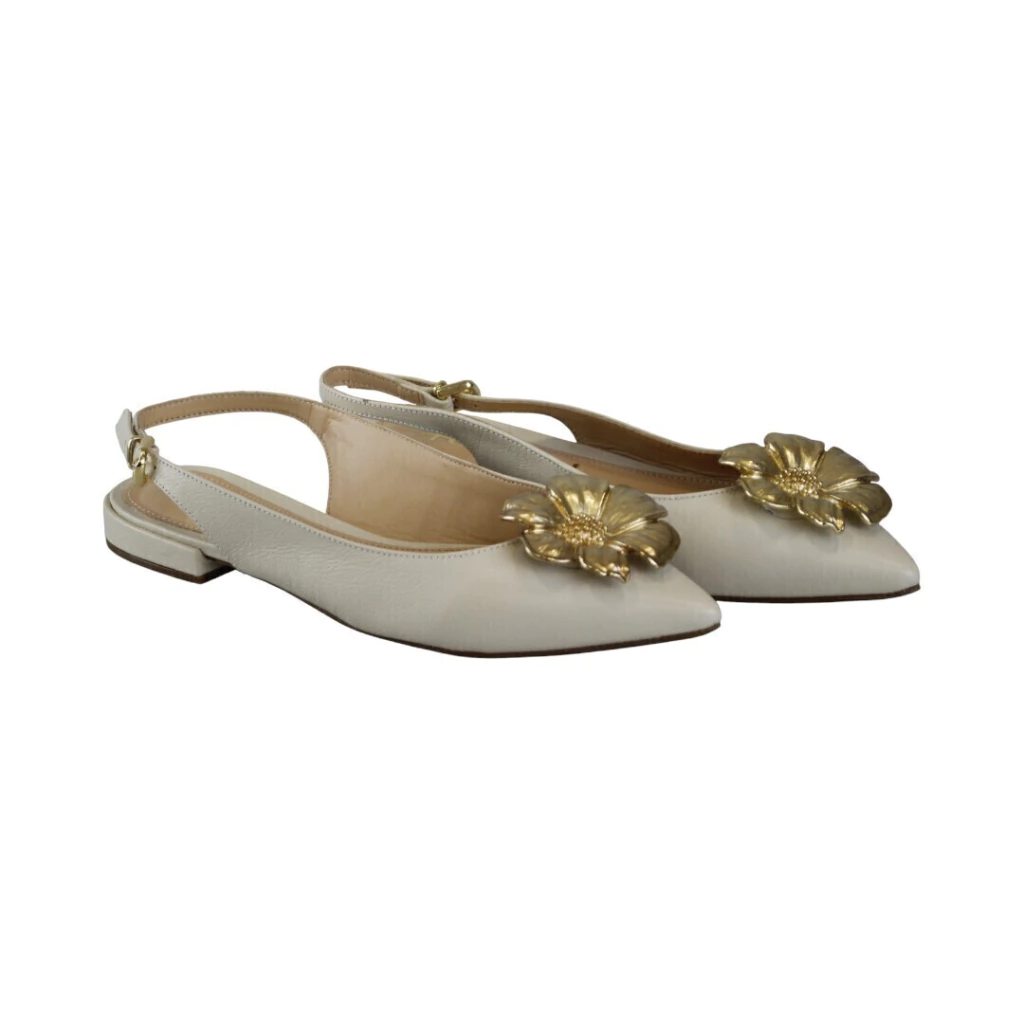 DESCRIÇÃO:Sapatilha feminina slingback em tom off-white/ivory com bico fino e acabamento em couro texturizado. Possui tira posterior com fivela dourada para ajuste e pequeno salto baixo quadrado. Aplicação grande em formato de flor metálica dourada sobre o cabedal como detalhe decorativo. Visual feminino, elegante e delicado, indicado para ocasiões casuais e mais formais.