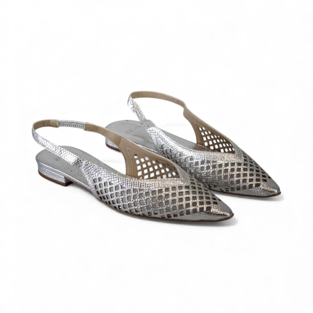 DESCRIÇÃO: Sapatilha slingback feminina prateada metalizada com textura tipo couro/listra (leve aspecto de animal print). Cabedal com recorte vazado em padrão quadriculado cobrindo o peito do pé e bico pontiagudo. Tira traseira fina com elástico no calcanhar, sola bem fina e pequeno salto bloco baixo. Visual moderno e elegante, com acabamento brilhante.