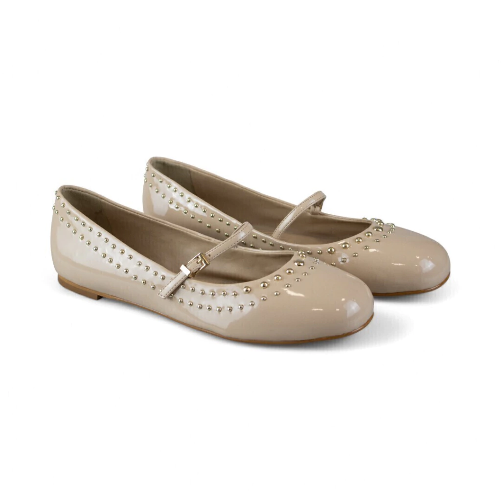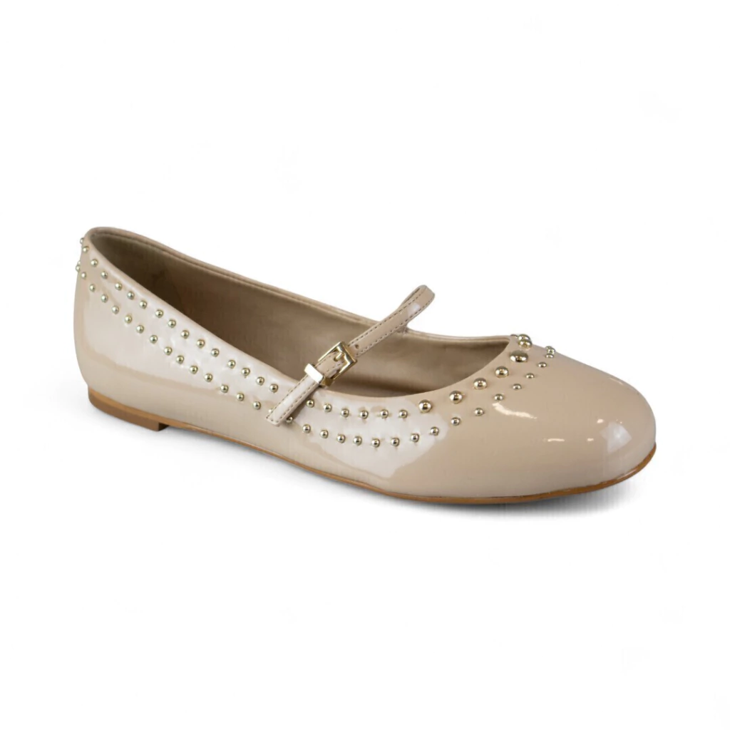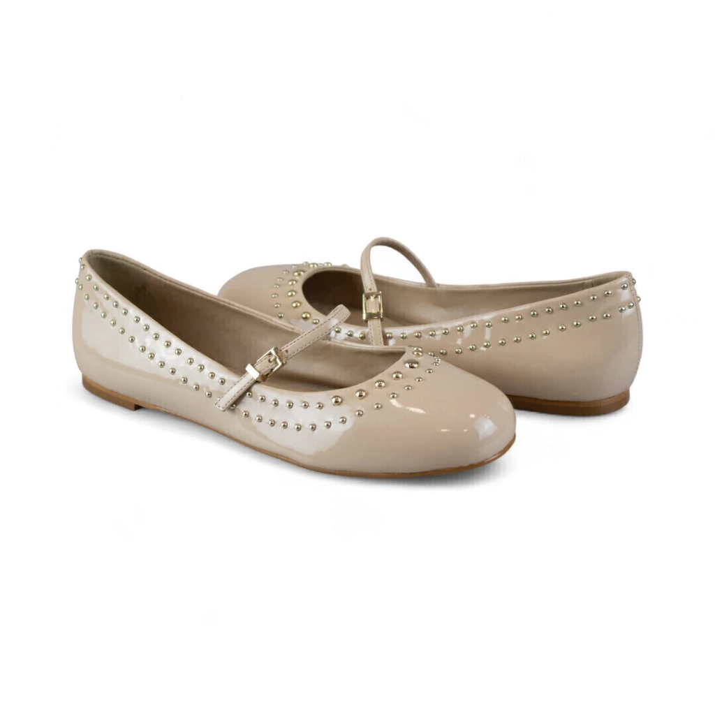 DESCRIÇÃO: Essa sapatilha é delicada e feminina, com acabamento em verniz nude que traz brilho e elegância ao visual. O modelo apresenta detalhe de pequenas tachas douradas aplicadas ao redor do cabedal, adicionando um toque moderno e sofisticado. A tira fina com fivela ajustável garante segurança e conforto, ideal para compor produções leves e refinadas do dia a dia.