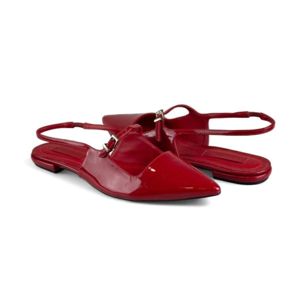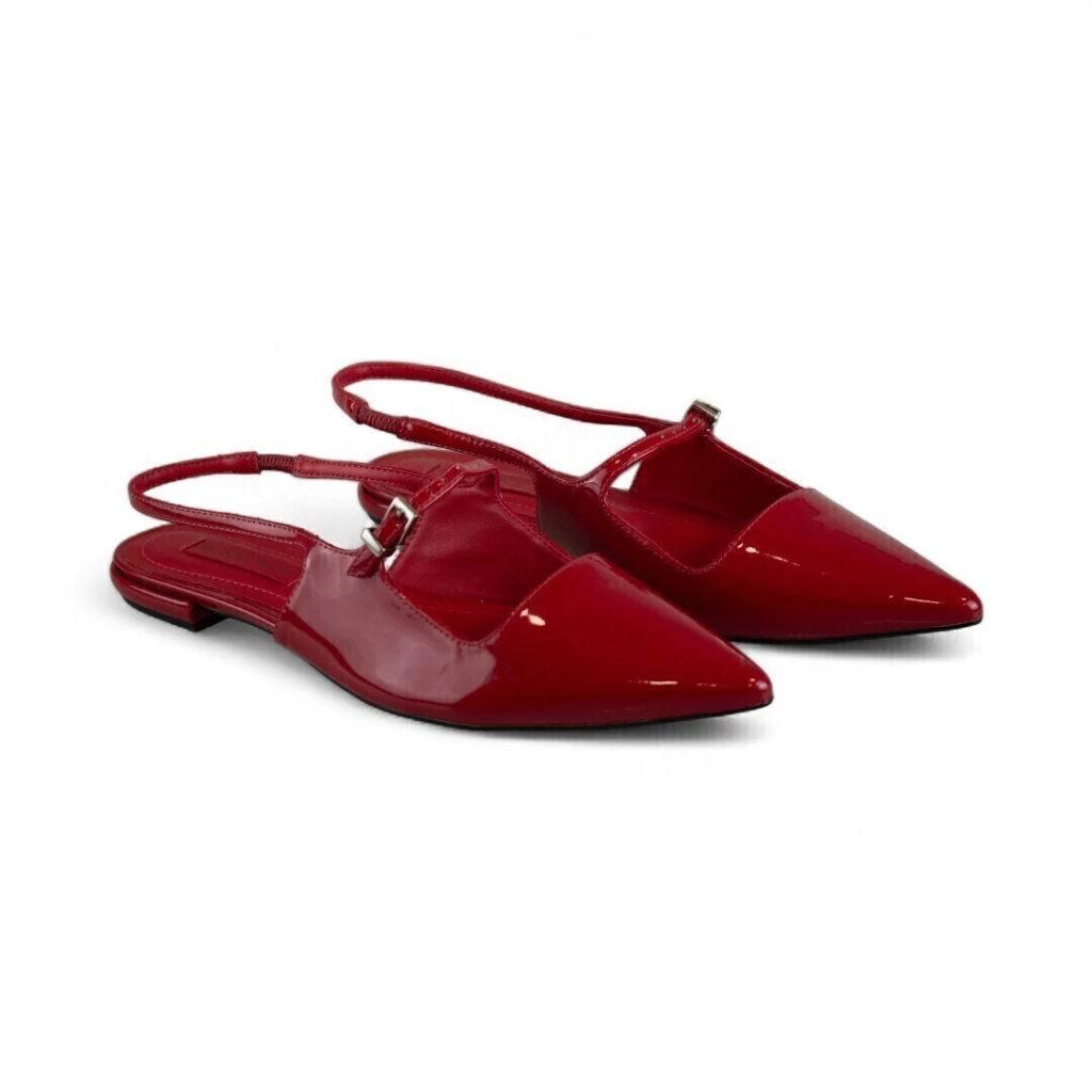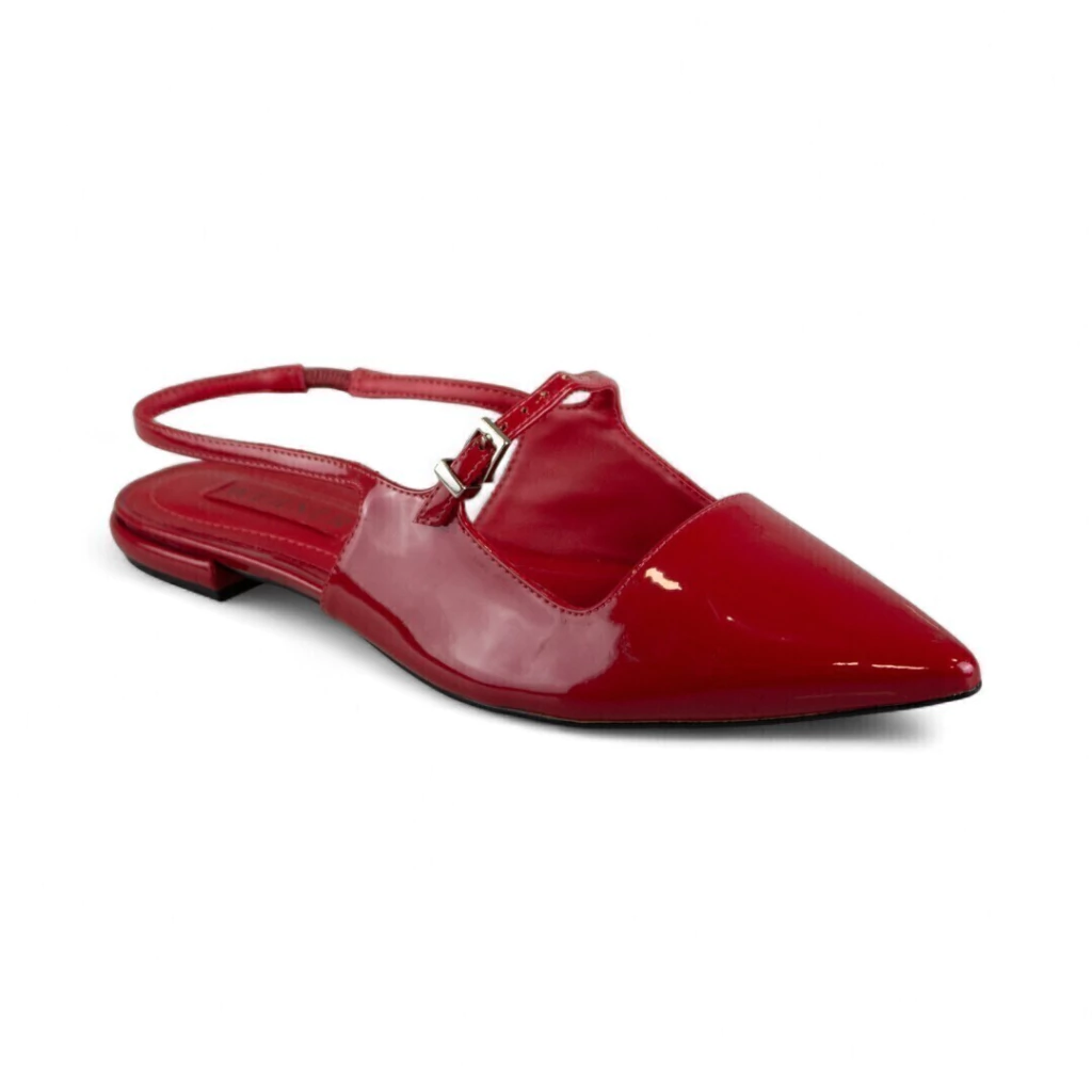 DESCRIÇÃO: Essa flat vermelha é a combinação perfeita entre elegância e conforto. O design com bico fino alonga o pé e adiciona um toque refinado ao visual, enquanto o acabamento em verniz traz brilho e sofisticação. A tira com fivela lateral garante ajuste ideal e delicadeza, e o calcanhar aberto confere leveza e praticidade ao calce. Um modelo versátil que transita facilmente entre o casual e o chic, ideal para compor looks de trabalho, passeios ou eventos em que o conforto é indispensável sem abrir mão do estilo.