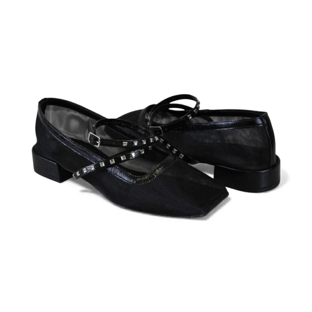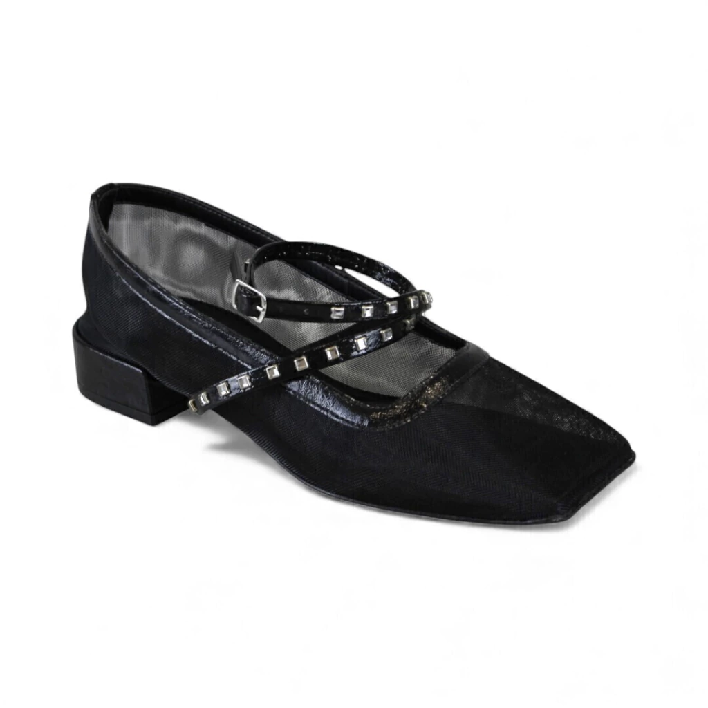 DESCRIÇÃO: Sapatilha/socassim feminina preta com cabedal em tecido transparente tipo mesh e acabamento em verniz nas bordas. Bico quadrado alongado, salto bloco muito baixo em tom preto. Duas tiras finas em X sobre o peito do pé com aplicações de pedrinhas quadradas brilhantes e fecho por pequena fivela lateral. Visual sofisticado e delicado, com toque moderno.