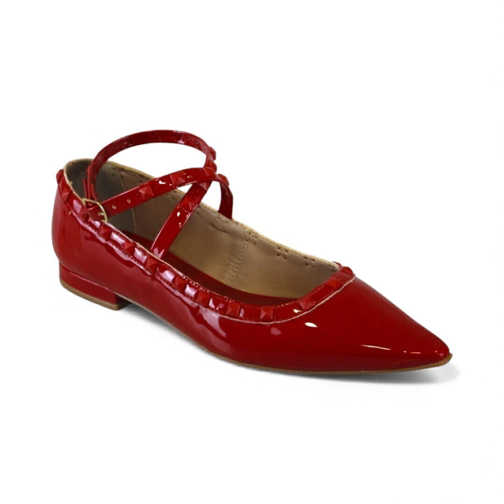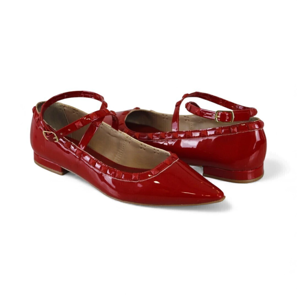 DESCRIÇÃO: Sapatilha feminina verniz vermelho com bico fino e pontiagudo. Contorno com detalhe franzido/mini babado no mesmo material. Duas tiras finas em X sobre o peito do pé que fecham por fivela lateral; salto bloco bem baixo. Palmilha em tom caramelo, sola fina. Visual feminino e elegante, com toque vintage.