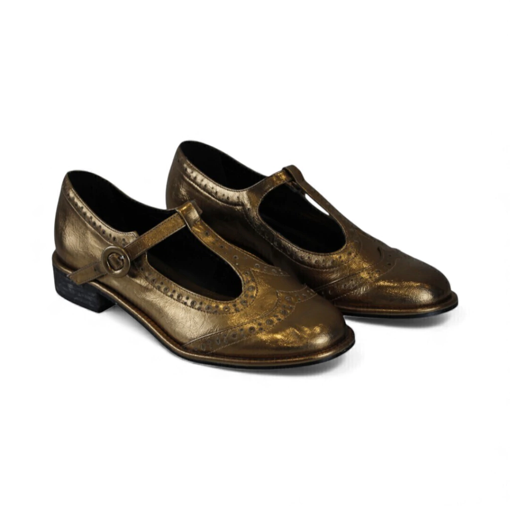 DESCRIÇÃO:Sapato feminino estilo Mary Jane/oxford em tom dourado metalizado com acabamento levemente craquelado. Bico arredondado com detalhes perfurados e recortes decorativos no estilo brogue; tira superior com fivela redonda lateral para fechamento. Salto baixo e quadrado em tom escuro, palmilha interna preta e sola fina. Visual retrô e sofisticado com acabamento brilhante.
