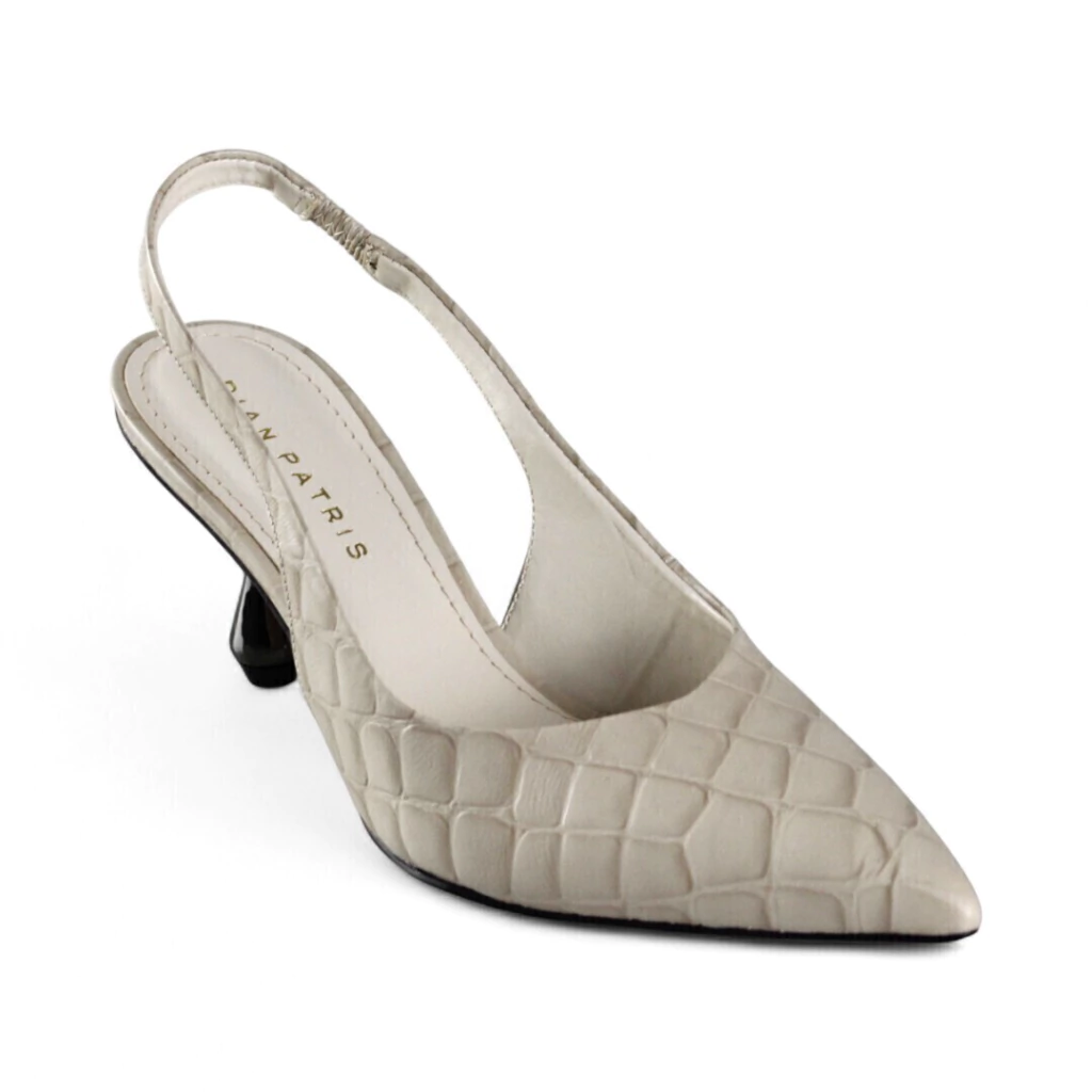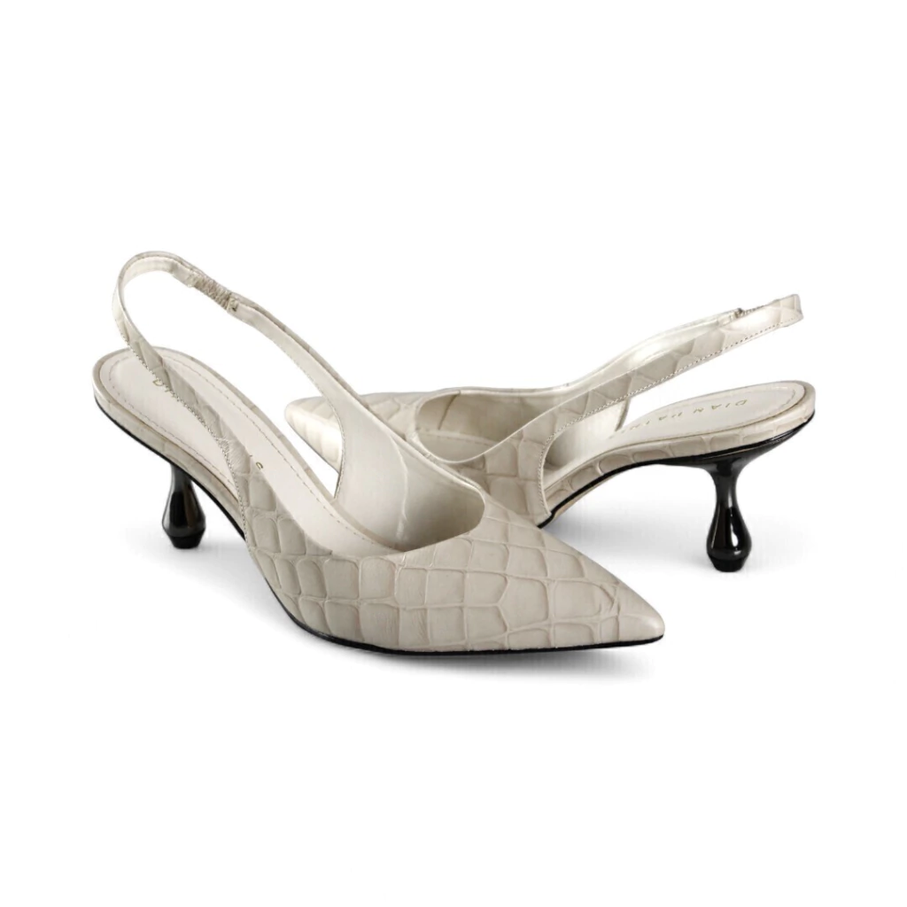 DESCRIÇÃO: Esse slingback off white é sinônimo de elegância e delicadeza. Com textura em efeito croco, o modelo traz sofisticação e modernidade ao visual. O bico fino alonga a silhueta, enquanto o salto baixo tipo taça garante conforto e charme. O design aberto no calcanhar, com tira ajustável, proporciona um encaixe perfeito e leveza ao caminhar. Ideal para compor looks refinados, do trabalho a eventos especiais.