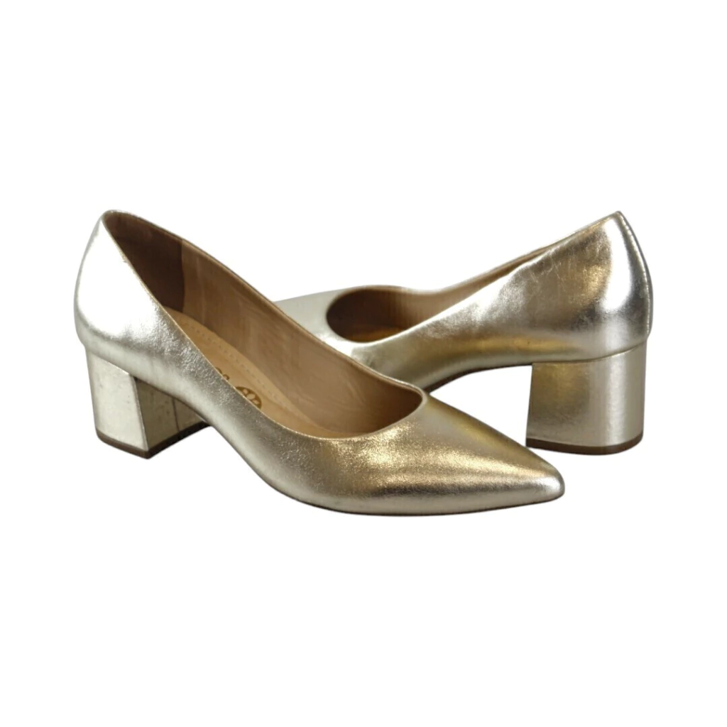 DESCRIÇÃO: Scarpin feminino metalizado ouro claro com acabamento brilhante, bico levemente pontudo, salto bloco médio revestido no mesmo material, palmilha levemente acolchoada e solado fino escuro.