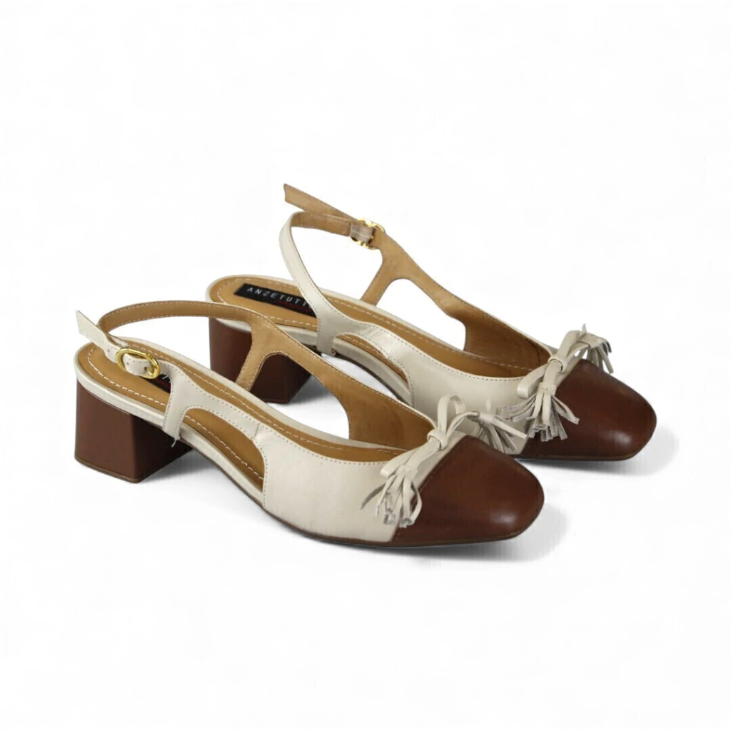 DESCRIÇÃO:Scarpin estilo slingback em tons de creme e marrom. O cabedal é em creme, enquanto a parte da frente é em marrom, com um detalhe de franjas que adiciona charme. Possui uma tira ajustável no calcanhar com fivela dourada, garantindo conforto e segurança. O salto é quadrado e baixo, proporcionando estabilidade. Ideal para compor looks casuais e elegantes.