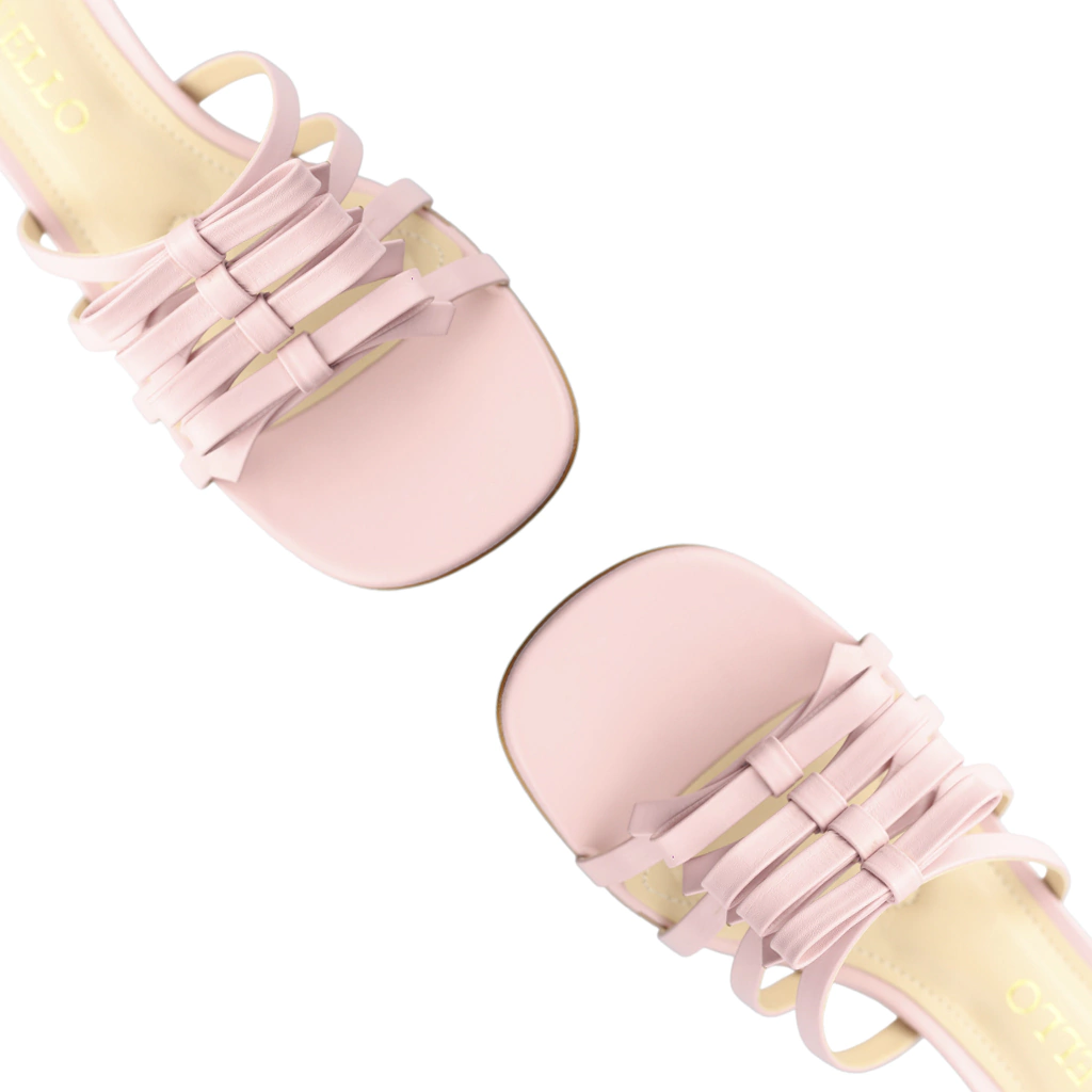 Tamanco salto taça, em tom rosa claro, com um design que exibe 4 tiras com detalhes em laços que confere um charme adicional ao modelo. O tamanco proporciona conforto e facilidade para o uso diário. Esses tamancos são ideais para eventos informais e dias de verão, combinando praticidade e um visual moderno. Elas trazem um toque de descontração e elegância, perfeitas para estilos casuais e relaxados.