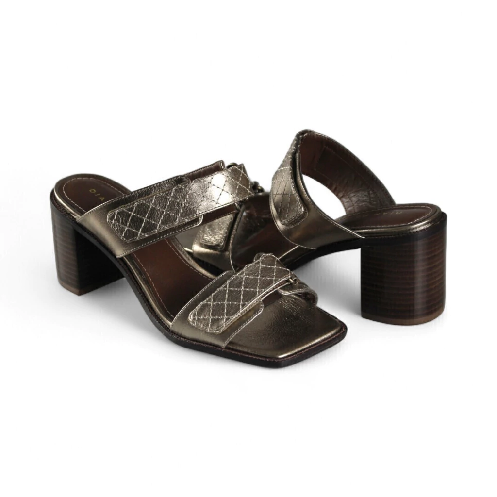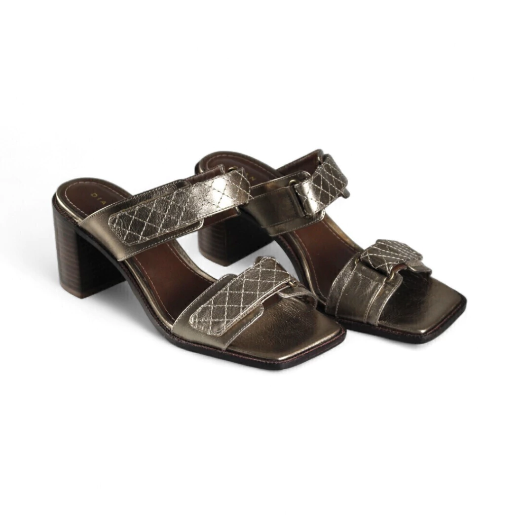 DESCRIÇÃO: Essa sandália metalizada é puro charme e elegância. O modelo conta com duas tiras largas no cabedal, com acabamento acolchoado e costura matelassê que adiciona um toque sofisticado. O salto bloco médio em tom amadeirado garante conforto e estabilidade, tornando-a perfeita para o dia a dia ou ocasiões especiais. O brilho sutil do tom dourado envelhecido eleva o visual com um toque moderno e refinado.