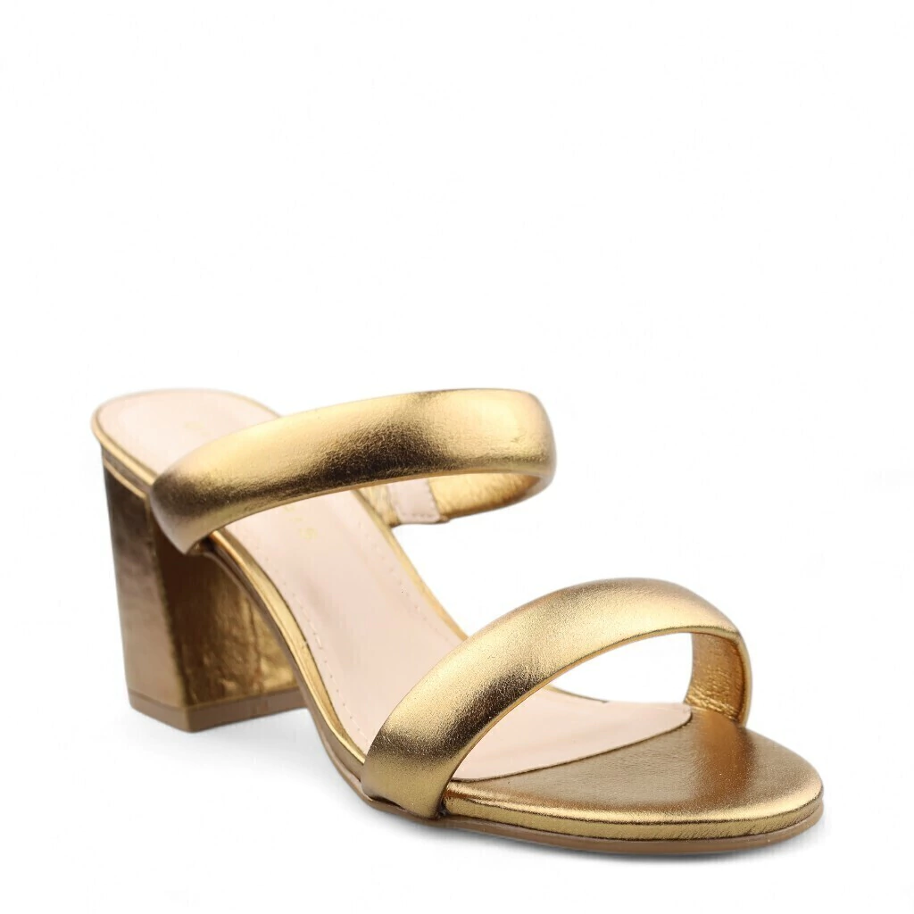 Descrição: A imagem apresenta um par de mules com salto bloco em um tom dourado metálico. O acabamento brilhante confere um aspecto glamouroso e elegante.